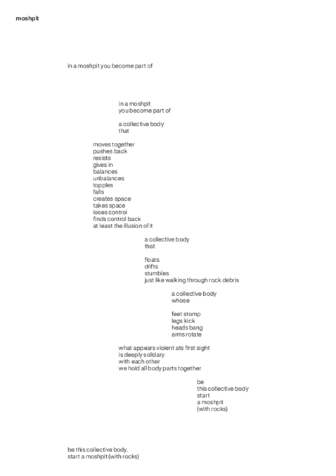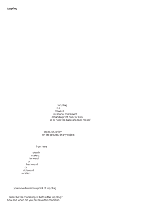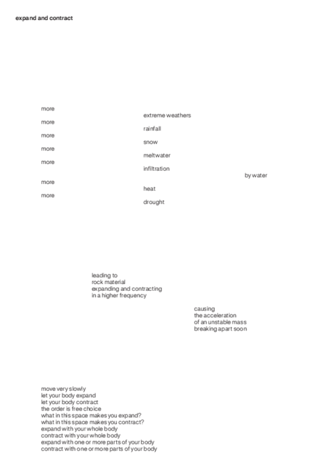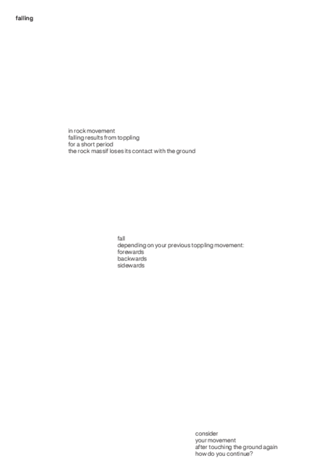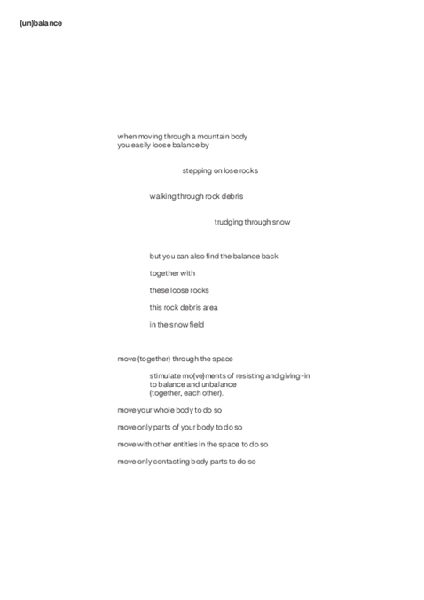 This is a continuous set of scores and invitations for performers to train with, mountaineers and hikers to use during a mountain visit, students and teachers to start a wide range of discussions about ethical approaches when working with more-than-humans, climate change, commemorative rituals in relation to mountain or landscapes in a broader sense. They can be used in practice and at the same time operate as discussion starters. The scores have been developed in collaboration with the hoch\/ogel /\/\oun†/\in (AU/DE), starting from field work consisting of daily visits to the /\/\oun†/\in in July 2024. Afterwards, I shared finding of the excursion with the Embodied Knowledge Research Group of the Lectorate of Theater and Dance at the Amsterdam University of the Arts and formulated this first set of scores and invitations. The set includes characteristics, environments and movements of /\/\oun†/\ins and rockslides in order to perform those at any location. For geological characteristics and movements I reached out to the Technical University of Munich Landslide Research Department who observes, and researches the hoch\/ogel /\/\oun†/\in and its movement and transformation. They provided me with articles and invited me to a course and an excursion. Altogether forms the base for the scores.
