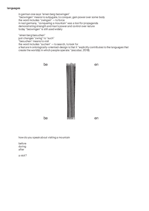 To outline an ethical and just position the scores and invitations incorporate amongst others the following features of ontologically-oriented-design defined by Arturo Escobar in 2018. They can be seen as hands-on invitations to act in either a /\/\oun†/\in site or any other space. With the development of the research, new features will be added and some of the existing ones might be be adjusted. Ontologically-oriented-design: