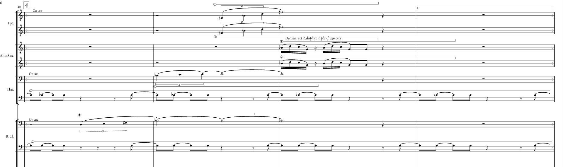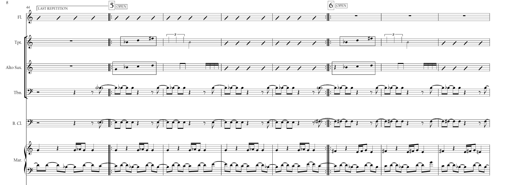 This piece consists of various numbered open sections, allowing flexibility in the number of repetitions. In the first version, transitions between sections depended entirely on my cues. However, after several rehearsals, I realized that if musicians initiated the cues themselves, the piece would feel more cohesive, and decision-making would become more collaborative and creative—essentially composing the music in real-time. When implementing the second version, I noticed an even greater benefit: the flow between sections improved as musicians used material from the next section as a cue, making the cells more interconnected.