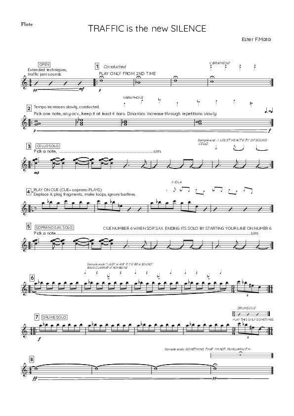 To address this, among other things -like using electronic samples as cues (see below)-, I introduced a linked cue system, where musicians would signal each other through their playing instead of relying solely on me. This small change brought immediate improvements: it reduced my burden as a conductor and encouraged more organic interaction among the musicians. A prime example of this approach can be seen in Traffic is the New Silence. We compare two versions of the flute part: