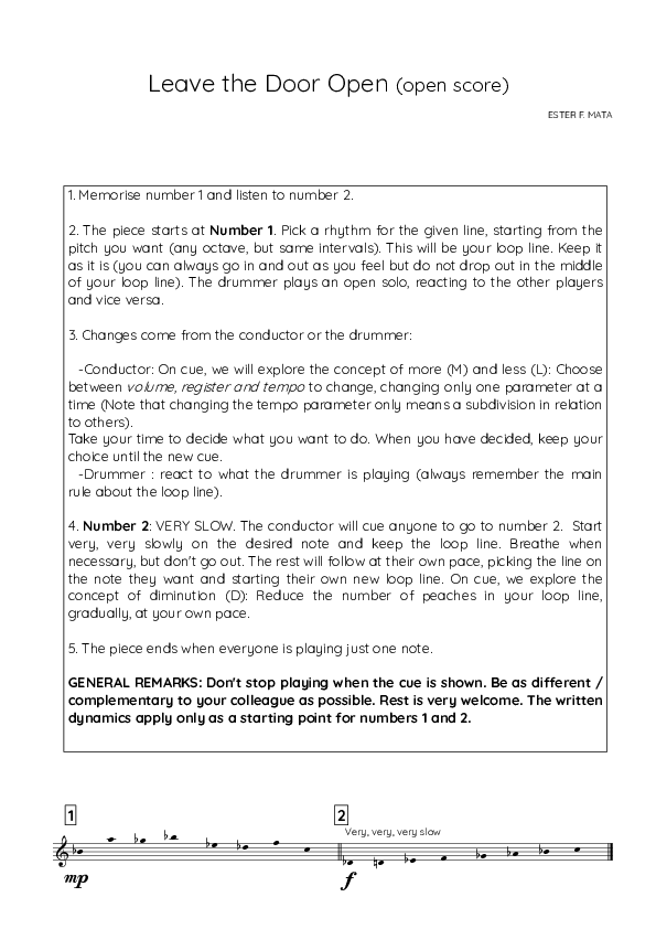 To facilitate this adjustment, I designed an exercise in which I reduced my leading and suggested material to the bare minimum, pushing the ensemble to rely solely on listening and generating ideas together. To do this, I transformed Leave the Door Open, originally a regularly notated piece, into a two-line score that leaned towards open improvisation. While the musical results aren't yet entirely satisfying, the process has encouraged deeper listening, greater self-awareness in relation to others, and a stronger sense of interaction and complementarity within the ensemble.