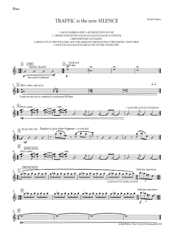 Another notable example of how we developed notation is seen in Traffic is the New Silence and the 'extra' staves I created to facilitate the linked cue system I mentioned earlier. This approach was inspired by elements of aleatoric music as well as existing comprovisational scores (see Vistar 5 by Bhagwati). The additional staff above each section serves two purposes: indicating who will cue the transition to the next section -similar to its use in The Spirit of the Depths, where samples cue musicians to play (see below)- and defining the shape of the melodic cue. When it’s your turn to cue—in the flute example in section 5—there is no extra staff. Instead, a written explanation guides how to do it.