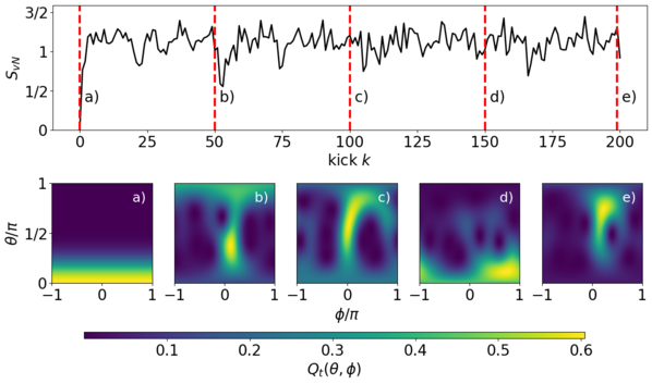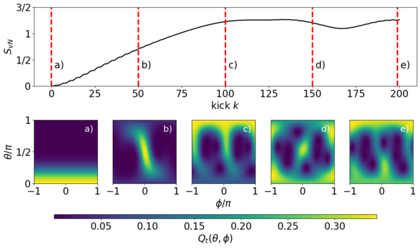 The top panel presents the time evolution of the entanglement entropy and the bottom panels (a-e) present Husimi Qₜ(θ,φ) function at kick k = 0, 50, 150, 200.