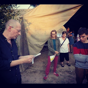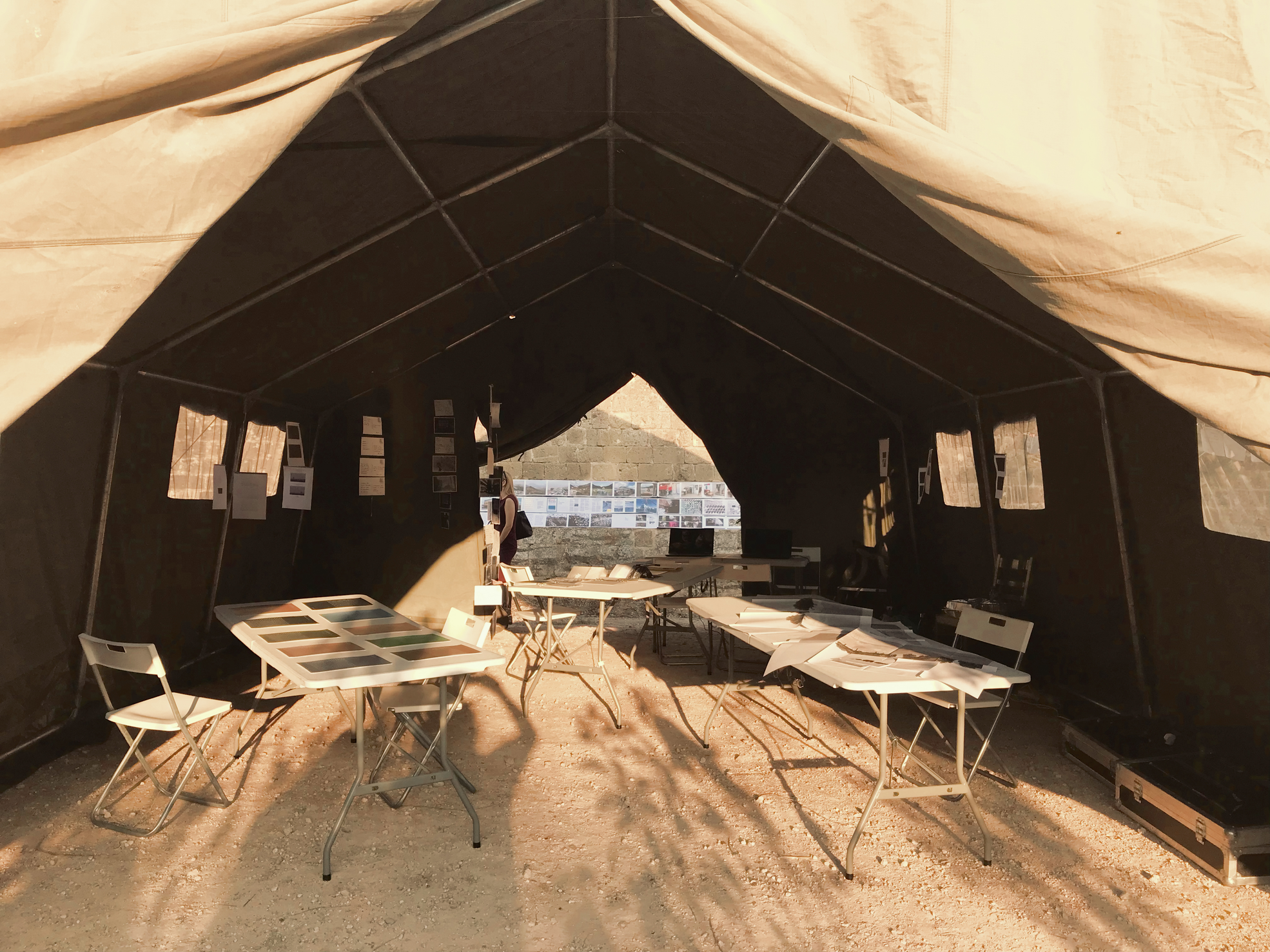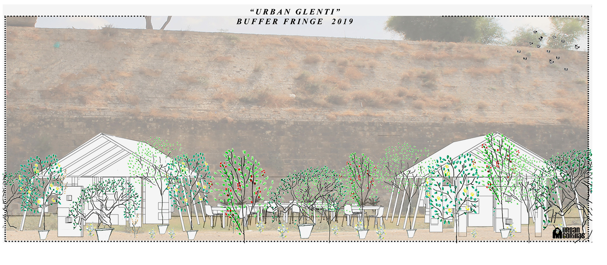 "Yiorgos Hadjichristou, Urban Guerrillas, Creative Center for Fluid Territories, with their interdisciplinary Urban Glendi. Behind a grove of plants and trees, a stage of a courtyard will be generated between two tents and the walls. The tents will accommodate exhibition of the participants work as a hanging garden in dialogue with the mobile forest that will surround them. The courtyard will act as the environment where the ‘Urban Glenti’ will be celebrated with presentations and discussions. By the end of the event, the plants will be planted in the area of the Home of Cooperation."