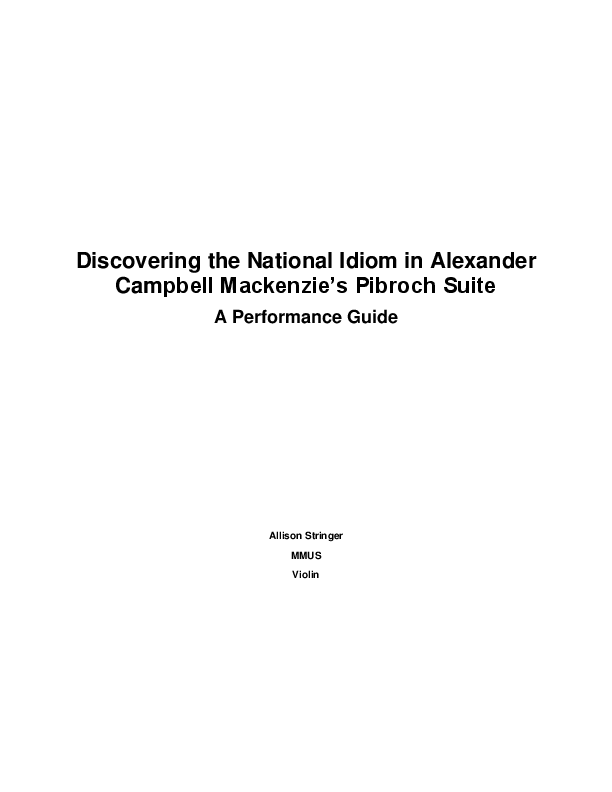 This research explores the connection between Scottish traditional music and Alexander Campbell Mackenzie’s classical composition, the Pibroch Suite, through the concept of Scotland’s national idiom. The purpose of this study is to create a performance guide for future violinists who are performing Mackenzie’s Pibroch Suite. The guide includes a foundation for Scottish ornamentation, bowings, rhythm and phrasing also including general historical background to the composer and the Scottish traditional music culture. As well as technical information, this research resulted in an annotated score that incorporates the addition of ornamentations, bowings, phrasings and general stylistic ideas in order to perform the Pibroch Suite in a Scottish and classically informed style. The study focuses on Scotland’s national idiom as a foundation to discovering a performance that blends Mackenzie’s Scottish origins with his classical compositional style. The work will act as a performance guide for future musicians as a basis for their own interpretations of the Pibroch Suite as well as future work in the field of folk/classical crossover.