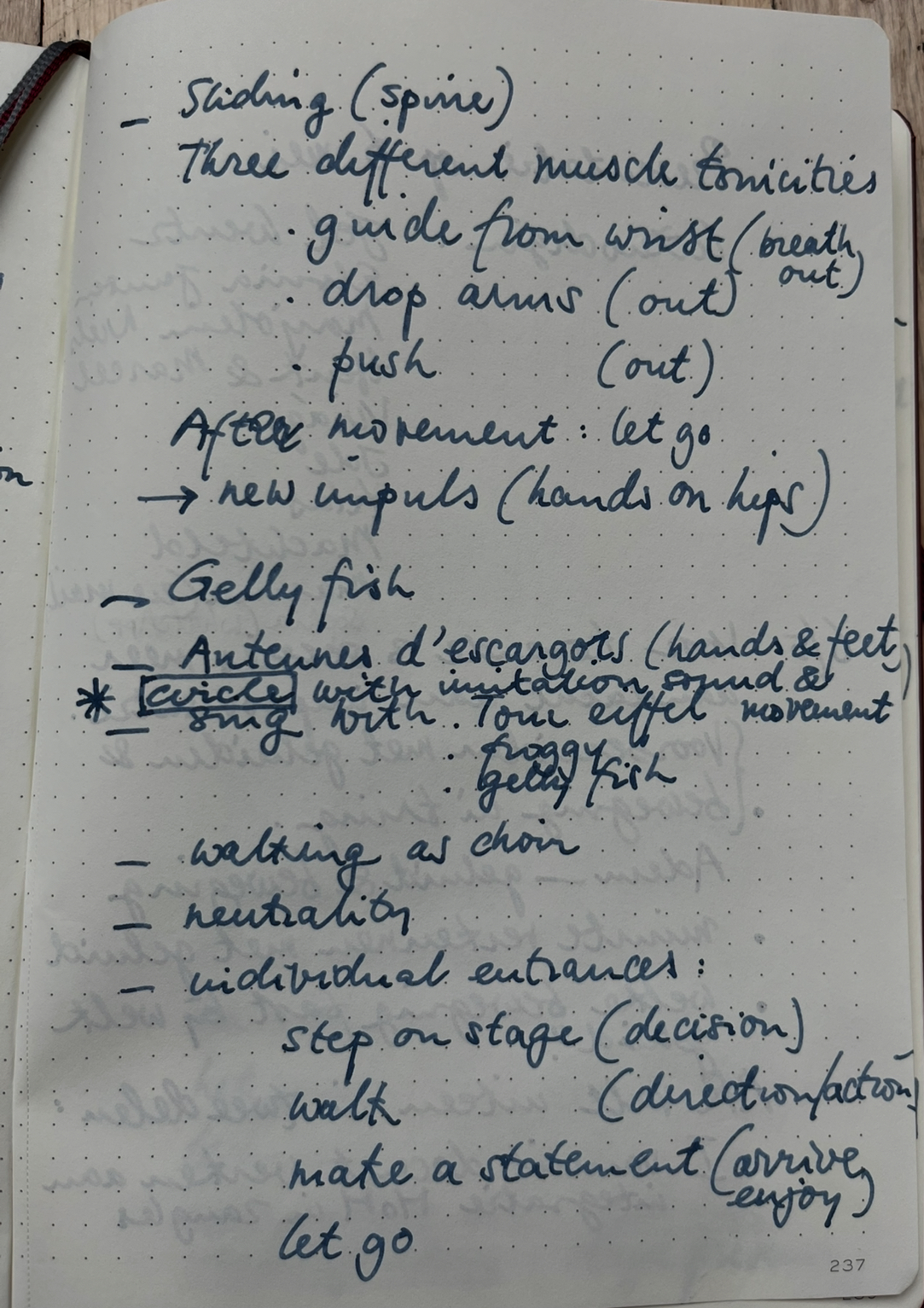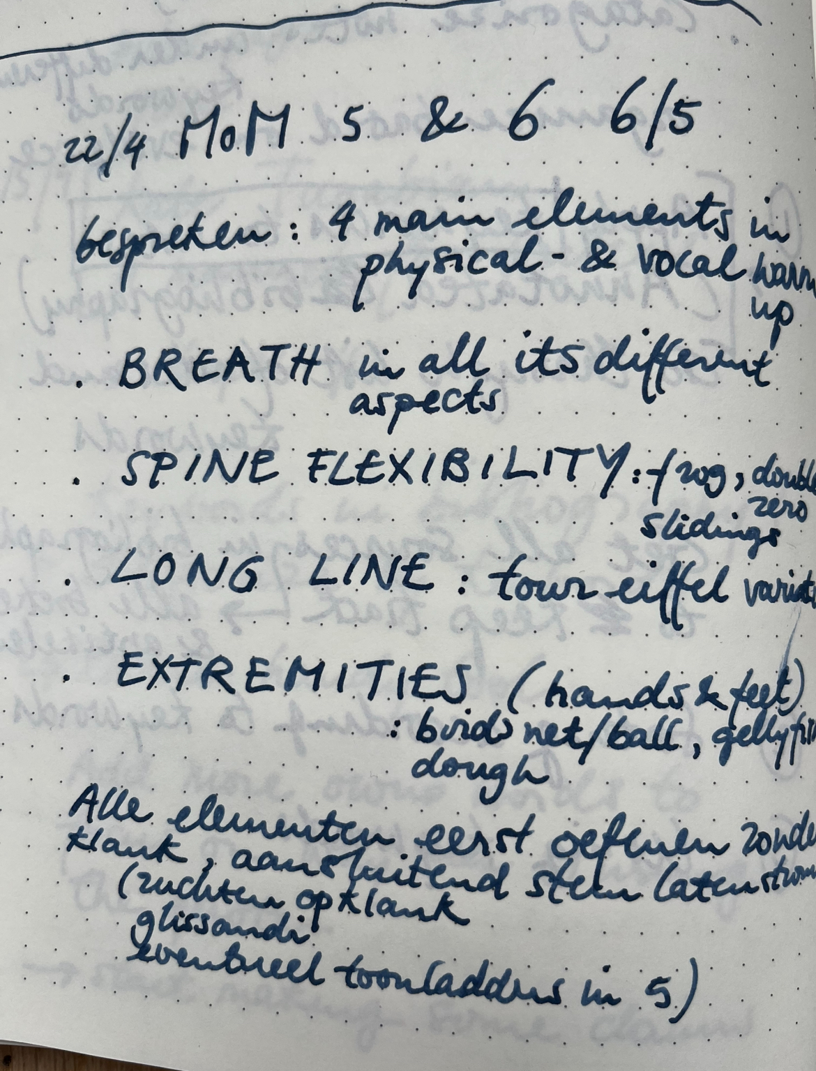 The third intervention of this exposition consists of my observations of and participation in physical acting classes at Codarts, University of the Arts, Rotterdam, spread over the 2023-2024 academic year. These weekly, one-and-a-half-hour-longclasses are tailored to voice students and taught by Virág Dezsö, who is the source of the Musicality of Movement approach. The lessons are for Bachelor I and II students and were also attended by Master I students. During the school year I took part in these classes four times, including the final presentation and assessment sessions—which I only observed.