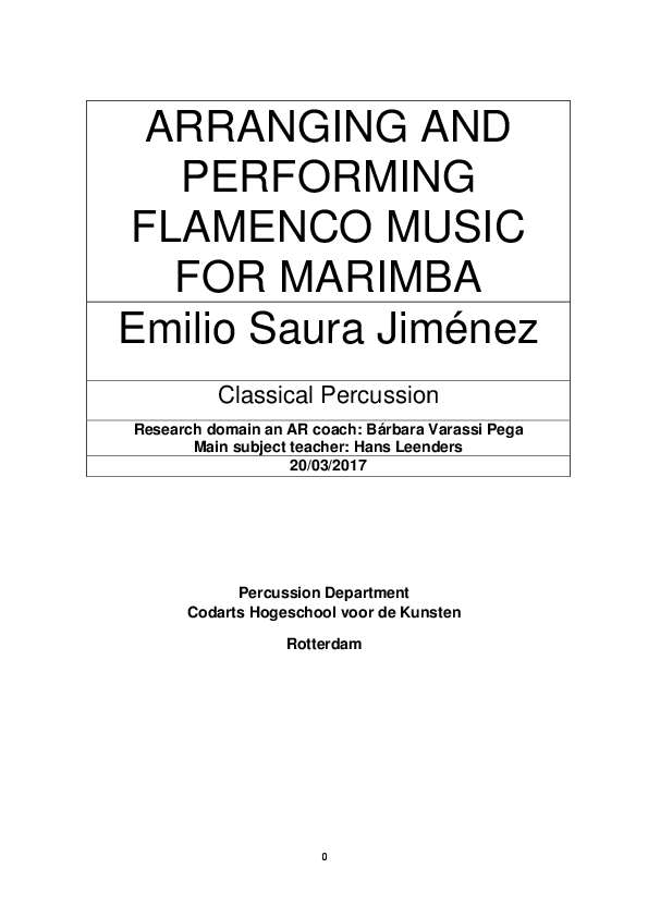 When I started my bachelor, I always have had the motivation to play a flamenco piece. I thought it would be important for me and my career, to be able of playing pieces from different styles. Also because I was not really motivated with the contemporary repertoire which I was playing in my bachelor years. I have been connected with the Spanish music, given that is my own music and I have listened flamenco music since I was young, because of my culture and the location of my hometown. But I´d never listen a marimbist playing flamenco. It was in 2014 in a flamenco festival close to my hometown (el cante de las minas, La Union) when I saw for the first time a marimba player playing a piece (an accompaniment for a singer) of flamenco. Instead of guitar, there was a marimba doing the accompaniment for the singer. Sound that marimba produced when the percussionist played those chords in the Phrygian mode called my attention suddenly. For this reason, I started to investigate deeper on the flamenco, trying to play some pieces from famous composers like Paco de Lucia, Tomatito, Moraito, Paco Peña, etc. until the moment that I thought that I had to do something else because it was not enough for me. Consequently, I took one of my favourite pieces and also one of the famous pieces of Paco de Lucia: Fuente y Caudal. For all of this, I formulated my first following research question: ``How can I arrange these pieces of flamenco keeping the idea of the music but with the sound of the marimba?´´ This question was huge and without a concrete message, because I wanted to arrange pieces but I didn´t know yet how many and more important, in which shape. When I really thought about how many pieces I wanted to arrange I decided to write the new research question, which was the following: How can I create my own version and arrangement of the pieces Fuente y Caudal by Paco de Lucia and La chanca by Tomatito in the marimba? But this question still needed more information so; I decided to write another one and which the current version of the research questions is: ``How can I create and perform my own arrangement of the pieces Fuente y Caudal by Paco de Lucia and La chanca by Tomatito keeping the main features of flamenco music? With this research question, I can show also the goal which I want to arrive. How I said before, I was not really motivated with the repertoire that I was playing. I had to play always contemporary pieces which I even really liked. Then, in my master, I wanted to explore different possibilities on the marimba, and the best way to do it was playing a different repertoire. My main goal is can be able to make arrangements of flamenco pieces and create my own repertoire based in this music. Even, I would like to show that marimba is not just an instrument for contemporary or classical music. Marimba is still a new instrument which we have to discover new sounds and new possibilities.