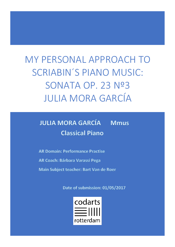 The purpose of my research was going deeper into the Scriabin´s musical language by the study of his sonata nº3. My motivation was given for surpassing all the difficulties that are present in his music and be able to understand and transmit all the incredible things that are inside of his personal music universe, instead of the bad experiences that I had as a listener in the past, listening Scriabin music from performers that didn´t know really what is the essence of Scriabin music. During all this process, I had the chance to experiment and discover a lot of things about how to manage tempo in his music, develop my imagination to find different colours in my piano playing, experiment with sustain and left pedals and taking risks to achieve all the contrast that this music requires. Also, the contact with incredible experts made me go further and try to improve every day and be always looking for something new to discover. It is only a starting point to know all the things that are in Scriabin´s music, but I think it has made me a better pianist and musician although is still a lot of work to do and improve.