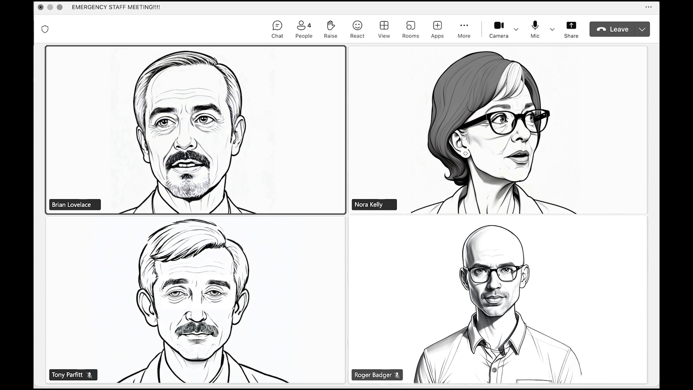 The presentation will include the delivery of a paper preceded by a new video work ‘Emergency Staff Meeting’ developed from the visual form of the comic/graphic novel, utilising AI generated imagery.