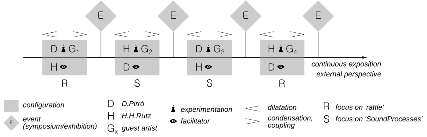 In-between the configurations which last in their intensive phase around two months, there are events, occasions to present the findings and process for the general public and expert audiences, using mixed forms from concerts and exhibitions to symposia and workshops. These are conducted in collaboration with our international partners. Parallel to this, a continuous exposition is the ongoing transcription of each group’s work into the online Research Catalogue, a platform that allows the interleaving of text, sonic and visual objects, and also their discussion with the artistic research community. Furthermore, all experiments were to be observed and analysed by a scientific researcher who is not actively involved themselves in the artistic production process.