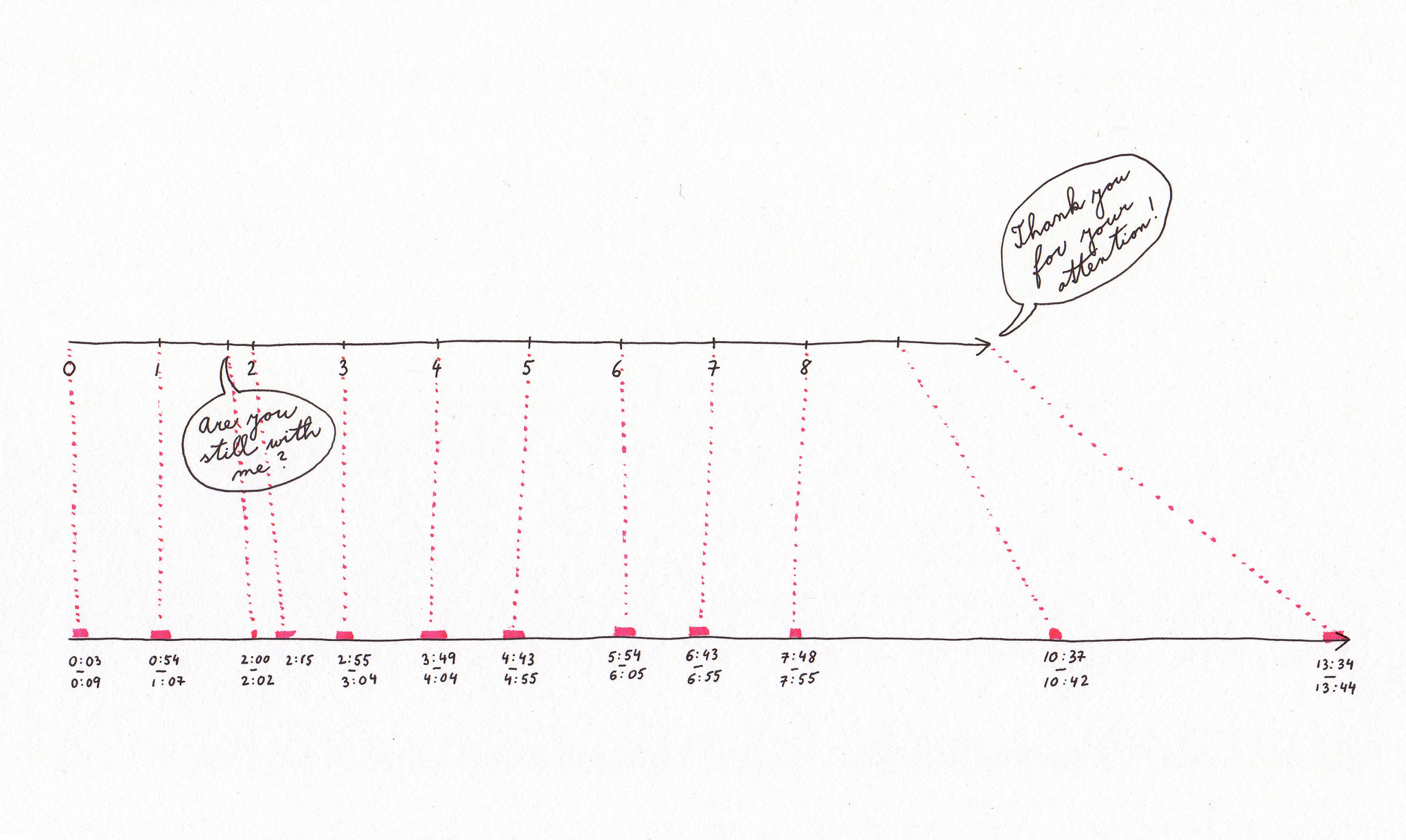 In this video paper, I dissect the decorum of oral presentation formats in academia and outline how the attention of the members of an audience diverges and converges with that of the speaker. I also share some observations about verbalizing non-verbal ideas, in particular about how a text description at the beginning of a project can tie its loose ends too tightly.