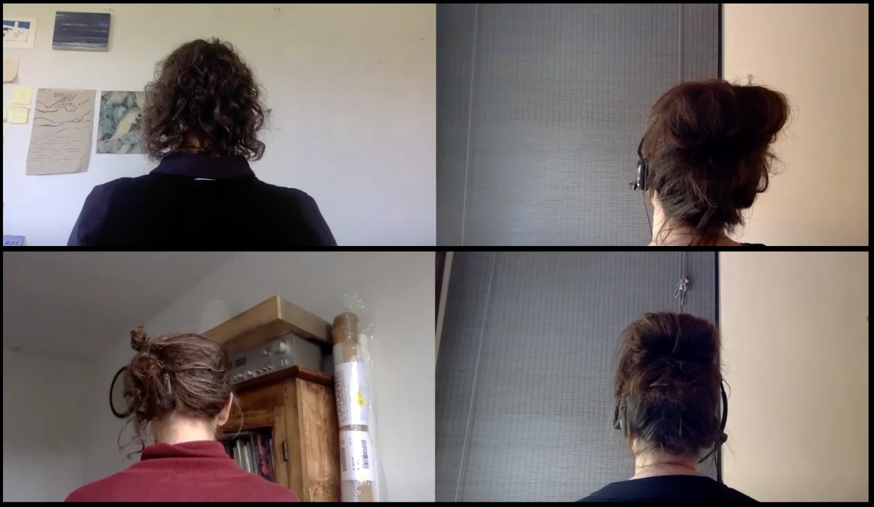 My presentation for Listen for Beginnings drew on a number of recent collaborations to explore how the ethico-aesthetic practice of listening (and being listened to) has increasingly become a vital thread within my enquiry. The performativity of my presentation involved weaving between different research artefacts and materials generated in and through artistic collaboration (including video and transcript extracts), alongside "thinking with" a wider critical-contextual milieu (specifically the writing of thinkers such as Gemma Corradi Fiumara and Lispeth Lipari) to consider the relational and ethical ramifications of a listening attitude. I explored how forms of languaging developed through listening might in turn call for different kinds of reception (alternative ways of listening and reading), alongside proposing how a ‘listening stance’ might inform an approach to collaboration — collaboration conceived as a mode of in-touch-ness that also allows for adjacency and alongside-ness, for indirectness and obliqueness, for the reciprocity of listening and being listened to. Within this published context, I want to allow a ‘breathing space’ (perhaps even a ‘listening space’) for selected fragments of an emergent vocabulary of/through listening generated from within a process of collaborative research. My paper comprises extracts of conversational transcript from three different collaborative projects where an immanent and reflexive language for attesting to the qualities and conditions of listening emerges in and through a language-based practice that is itself imbued with a listening attitude — one that involves listening to oneself, listening to others, listening for emergent wor(l)ds. The textual extracts have been generated largely through a practice of conversation and/or the experimental reading of conversational transcripts within the following projects: I – “Dorsal Practices” is an artistic research collaboration with Katrina Brown for exploring how a back-oriented awareness and attitude might shape and inform our embodied, affective and relational experience of being-in-the-world; II — “thinking aesthetic thinking through aesthetic research practices” is an artistic research project involving Alex Arteaga, Emma Cocker, Nicole Wendel (with Sabine Zahn in the first phase) that focuses on ways in which aesthetic research practices enable and realise a specific form of thinking: aesthetic thinking; III — “The Appearance of the More” is an artistic research collaboration with Nicole Wendel for bringing-into-relation the unfolding, embodied processes of drawing and languaging as resonating fields of perception and cooperation.