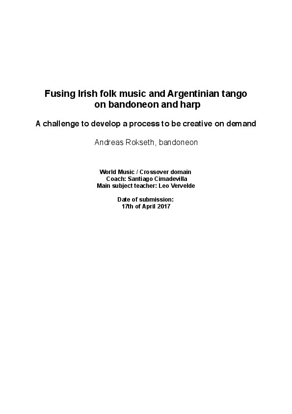 Motivation The deep motivation behind my research is that I want to be an earning, versatile, professional musician. Through my Masters I want to make myself the best musician I can be. Playing the instrument bandoneon, I specialise in a narrow field of music, namely the Argentine tango. In life as a musician however, a lot of opportunities will turn up that are outside my field of expertise. I wanted to find a way to enable myself to take on all of these opportunities. The way to do this, was to find a process to be able to be creative on demand. Such a process would enable me to take on opportunities in unknown musical territory, allowing me to develop further in my versatility as a musician. Goals The most significant goal for me was that I wanted to make for myself a process to be creative on demand - a step by step process to be creative when I need to be creative, regardless of what state of mind I might find myself in. To be creative beyond those special times when “the muses come” or when “inspiration hits.” Having the tools to be creative without feeling inspired also takes away the pressure of being inspired, letting the sought-after state of mind flow more naturally and more productively. So, the personal challenge I set was how could I make such a process for myself? The first step was to find a way to get past creatives’ worst nightmare - the - the big blank page. In order to do this, I set myself some very narrow limits within which I had to work, in order get the initial spark of creativity started. So, I put myself in a small, difficult box. A box of clear limitations, from which I would have to use my skills, talent, and musicianship to get out of by making my own strong artistic decisions. The box I made, was the task of creating an original piece of music for harp and bandoneon, fusing Argentinian tango - which I knew a lot about, and Irish jig - which I knew little about. I chose those specific limitations for several reasons. The first is that I have a duo with my sister Julie Rokseth, which is intended to represent a big part of my livelihood as a musician. I was interested to create a fusion of Celtic music and tango because in the duo we have been composing our own music with undetermined or unspecified influences, but that has had both tango and Celtic musical elements in them. I was interested to turn the vague inspiration of Celtic music into a clear inspiration for my music, and would do it through composing a fusion of tango and jig by making informed artistic decisions. Secondly, I reduced the large concept of Irish/Celtic music down to a very specific and limiting type of tune, the jig. This was once again to ensure that I would have very specific parameters for my box. Thirdly, I wanted to expand how I can use the bandoneon to adapt to challenges of new styles and be able to switch between them effortlessly.