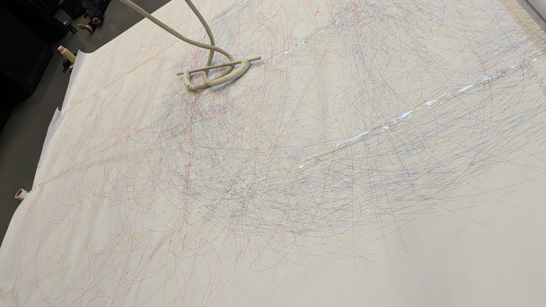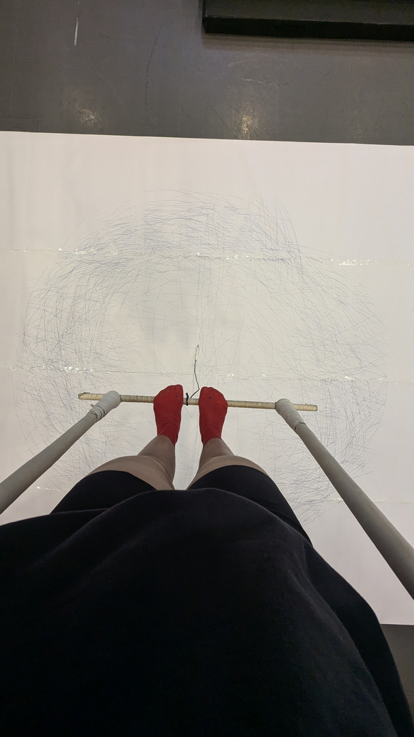 Hanging the trapeze lower and wrapping myself up in it allowd me to hold pens in my hand and take more control over the drawing.