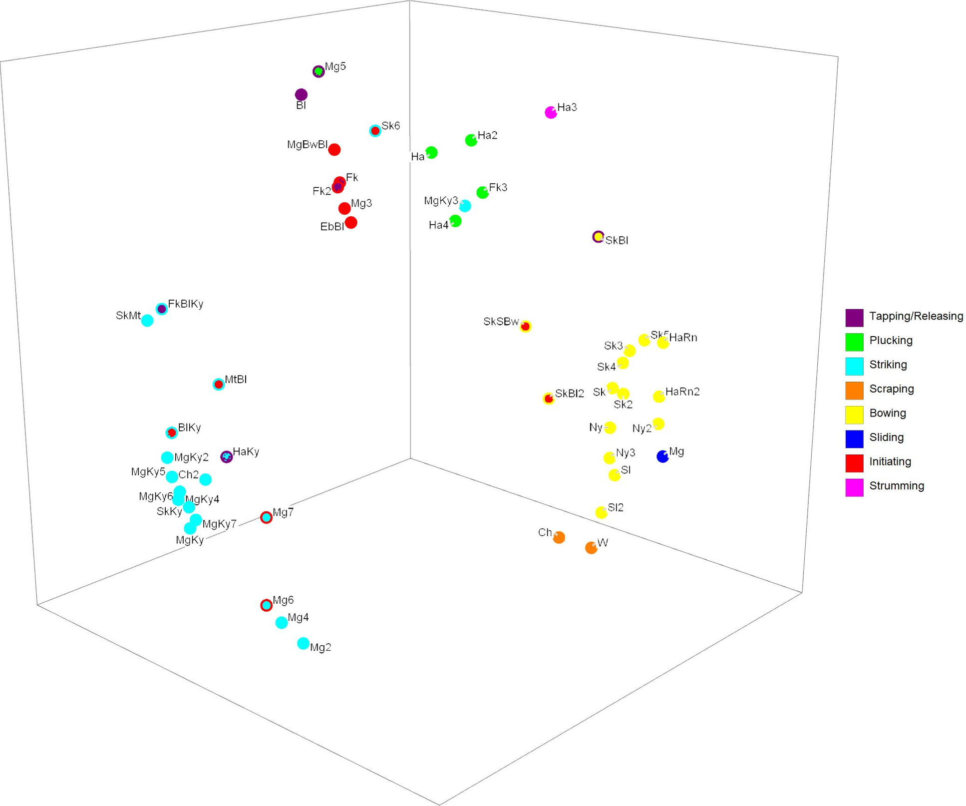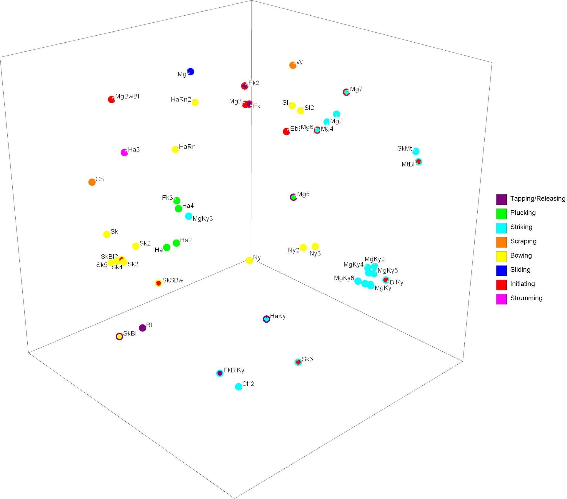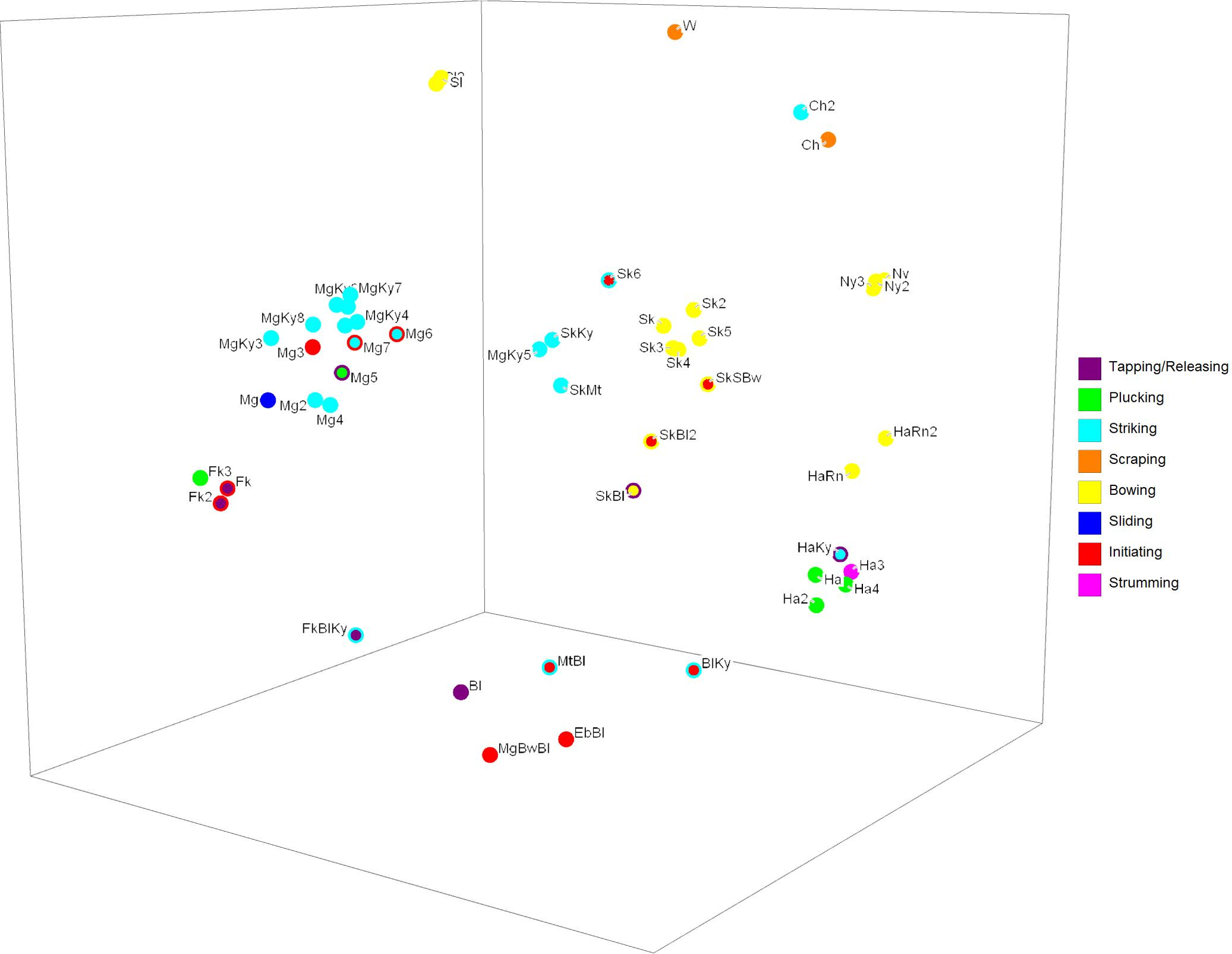 The Gesture Timbre Map shows the perceived (dis)similarity of sounds in terms of the physical gestures used to produce them. The sounds are highly scattered, pointing to a vast variety of largely independent gestures. Few groupings can be observed regarding playing methods (striking and plucking), which are represented in the color allocated to each sound.