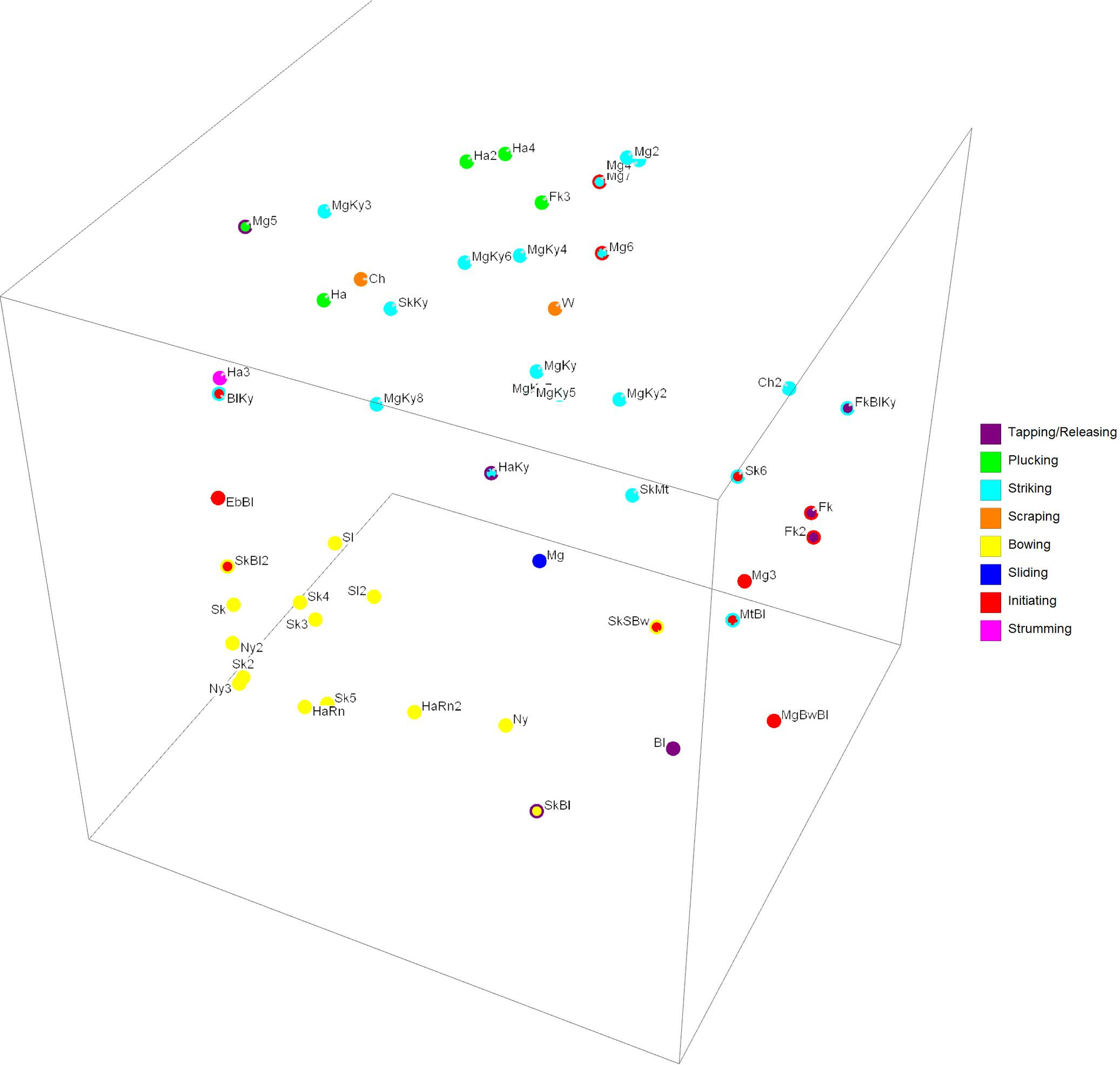 The Object Timbre Map shows the perceived (dis)similarity of sounds in terms of the objects that were used to produce them. Sounds that were produced using the same object are represented as being closer to one another in space. Sounds were also differentiated between in terms of the way in which the objects were used, which also affected the distance between sounds. The color labels the sounds according to playing methods.