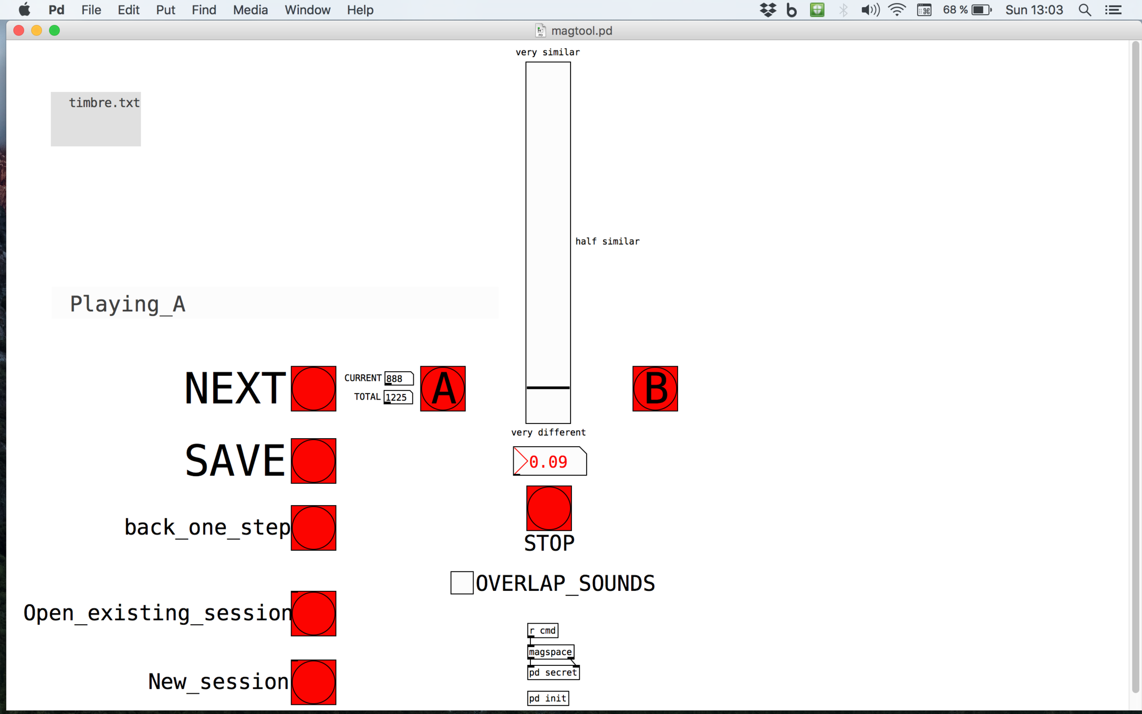 To conduct the study, Palle Dahlstedt built a software tool which enabled me to listen to all possible sound pairs out of the 50 chosen sounds in random order. I would then give the pair a (dis)similarity rating based on different perceptive performance qualities and the questions I had placed at the center of the study. The tool randomly picked sound pairs, without revealing the names or descriptions of the sounds I was listening to. I then compared sound A to sound B and rated it on a scale from 0, very different, to 1, very similar.