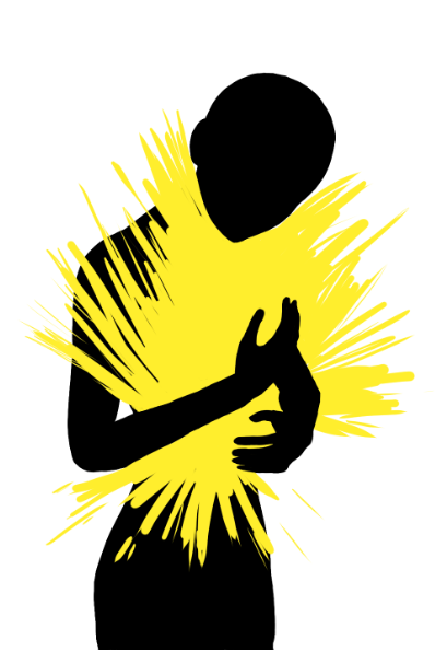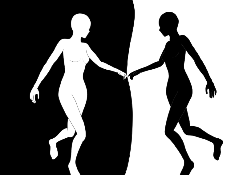 Two figures, one white and one black: they touch each other, symbolizing contact between shadow and light