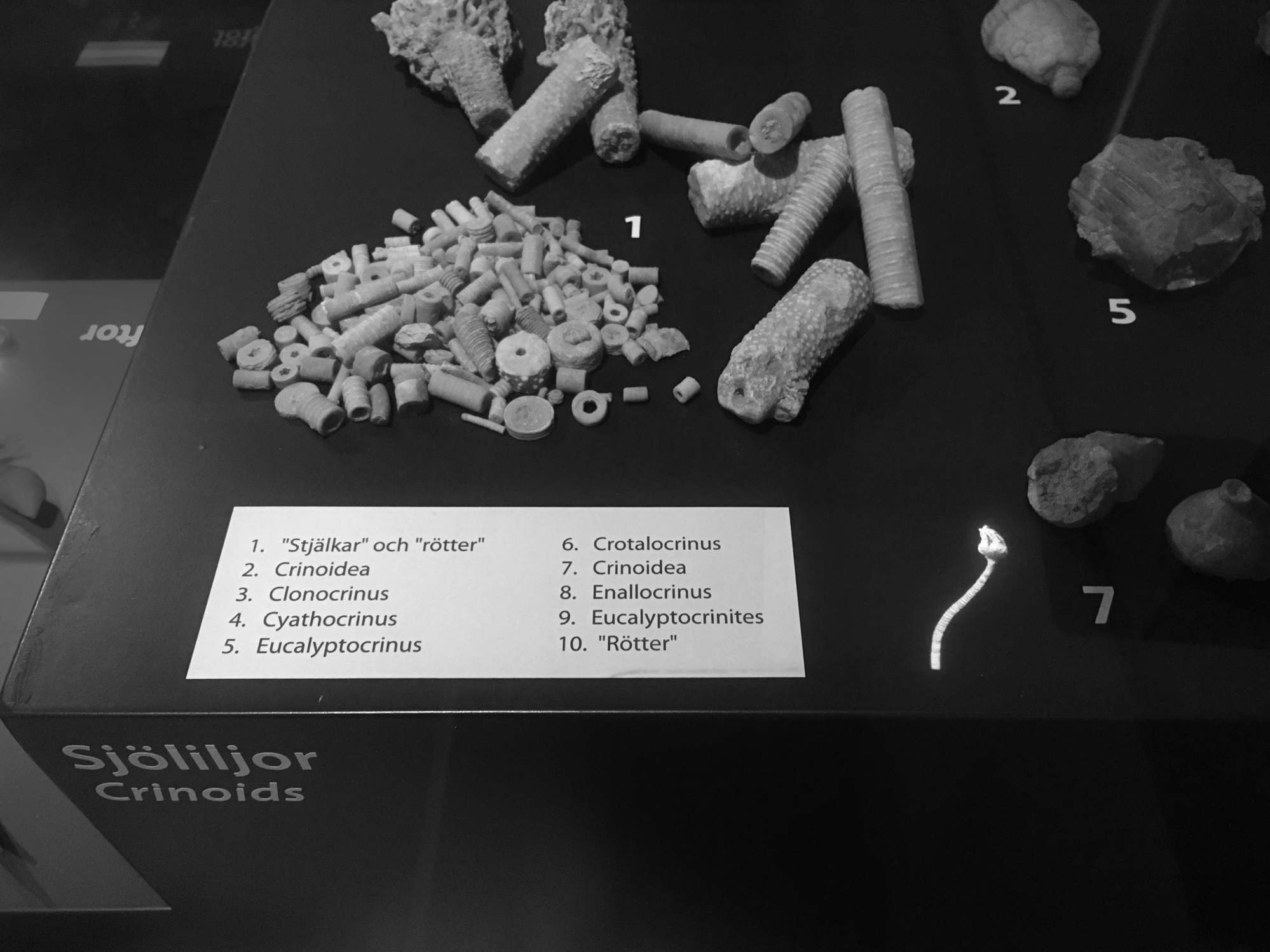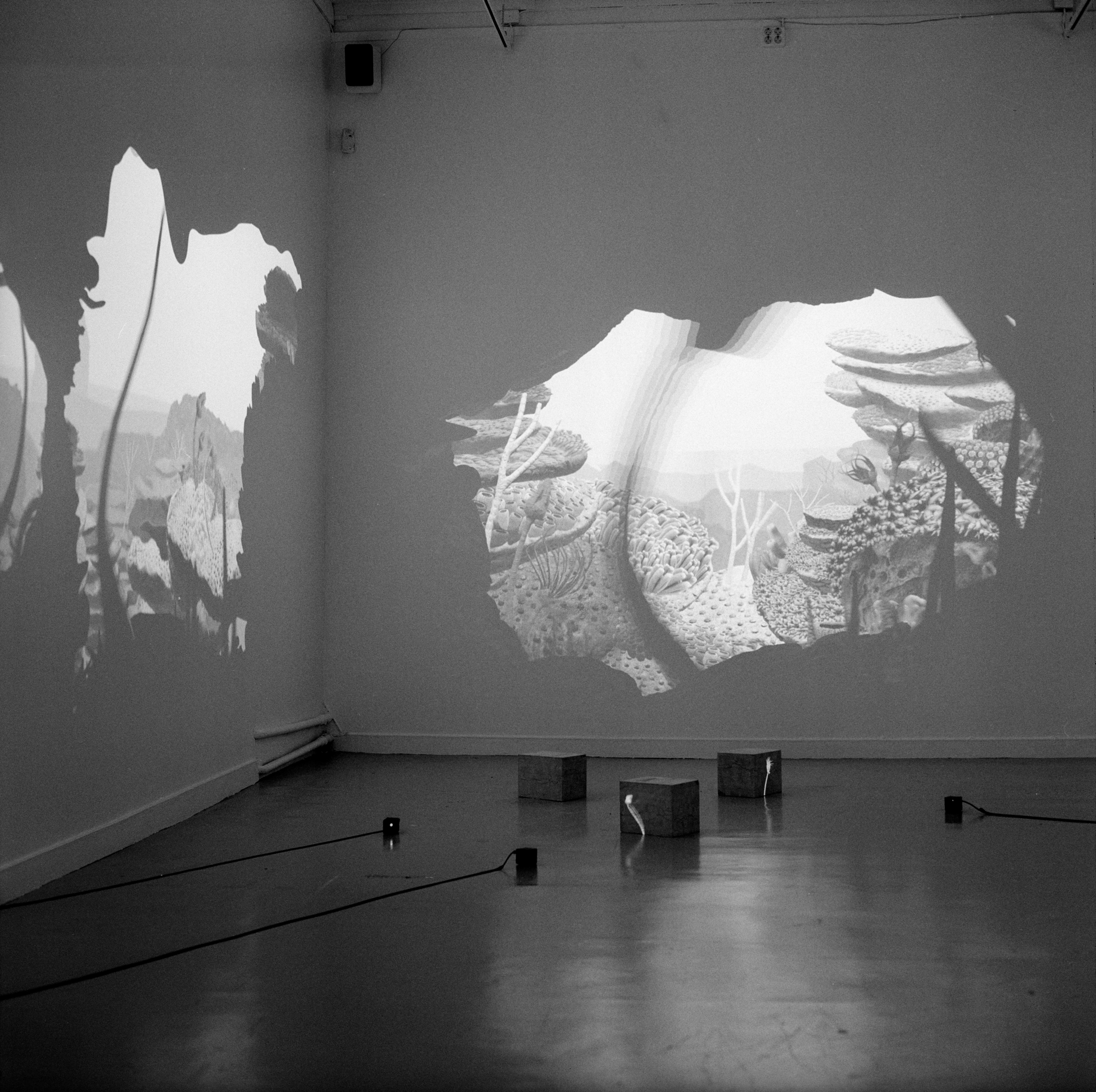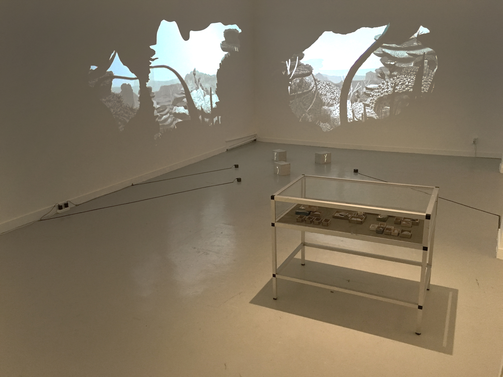 In a glass vitrine borrowed from the natural history museum, clay imprints has taken the place of fossils in the archive boxes. Projected on the walls are animated underwater landscapes remenicient of the natural history museum diorama. The landscape is put together by the animated clay imprints. On the floor are three limestone blocks, cross section of the Gotland coral bedrock. They form the projection surface for three more re-animated reef organisms. In the fossil exhibition at the museum of natural history an animated Crinoid (sea lily) is projected.