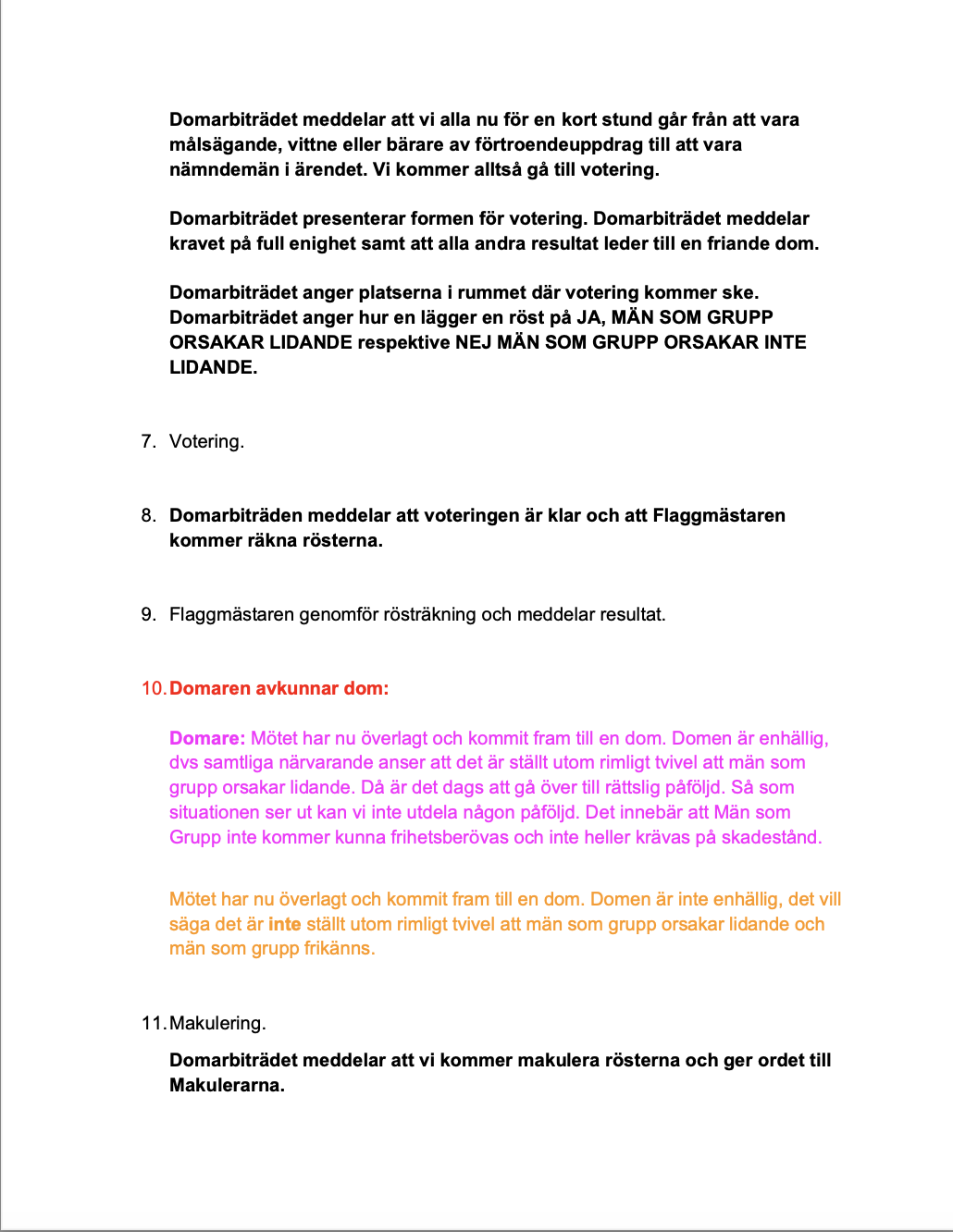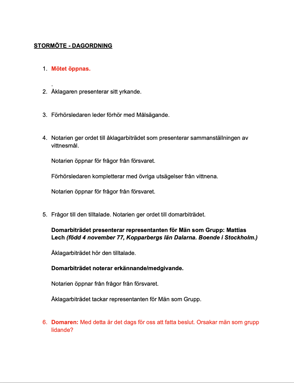 Besökaren anländer till något som liknar en poesiafton, vars fokus ligger på kvinnliga finlandssvenska poeter. Värdarna för evenemanget ställer diskret besökaren en kryptisk kontrollfråga och snart blir det tydligt att poesiläsningen är en täckmantel för en annan verksamhet. Besökarna delas upp i två grupper utifrån sina erfarenheter av män som grupp. De som uttryckt att de har en övervägande positiv eller okomplicerad relation till män som grupp hänvisas till ett uppehållsrum där de spenderar resten av kvällen i sällskap av en manlig aktör i 40-årsåldern, fotbollsspelet FIFA, en akustisk gitarr, ett sexpack öl, en hämtpizza samt strategispelet Risk. Besökare som har uttryckt att de har en komplicerad eller otrygg relation till män som grupp inleder en anonymiserad kartläggning av gruppens samlade erfarenheter. Vittnesmål samlas in, aggressioner noteras (såsom ”osakligt ifrågasättande av annans kompetens”, ”förlöjligande” eller ”osakligt anspråk på annans tid eller ansträngning”) samt uppvisade skador (såsom ”otrygghet” eller ”självhat”). Steg för steg förbereder sig gruppen inför vad som visar sig vara en ljusskygg folkdomstol. Ansvar fördelas, det väljs rösträknare, domare och åklagare. Med stor försiktighet och många ritualer installerar sig domstolen och via telefon kontaktas en representant för ”män som grupp” för att delges misstanke. Utfrågning följer och därefter fattar gruppen som helhet sitt beslut: ”Orsakar män som grupp lidande?” Kvällen avslutas med att domstolen gemensamt signalerar kvällens domslut till förbipasserande med hjälp av signalflaggor.