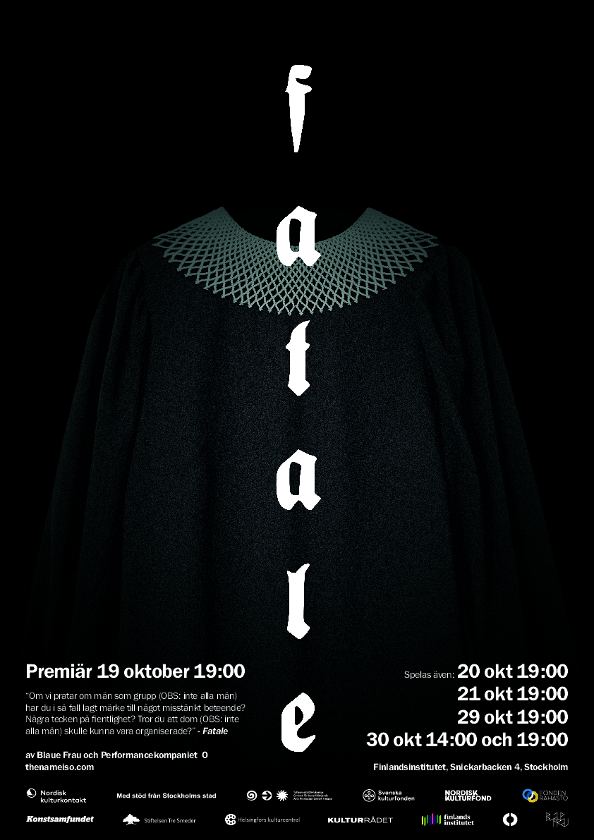 Jag tillfrågades om att ingå i projektet i egenskap av processledare. I mitt övriga arbetsliv delar jag alltid det huvudsakliga ansvaret för projekten med en eller två konstnärliga kollegor. I relationen med dessa kollegor har jag strävat efter så hög grad av symmetri som möjligt, gällande ansvar och mandat för det konstnärliga uttrycket såväl för som processen som sådan. I arbetet med FATALE upplevde jag mig ensam i min särart, då jag var den enda i min funktion medan övriga medverkade utifrån positionen som “aktör”, vilket gjorde att jag ofta upplevde en stor ensamhet i mitt uppdrag. Jag hade också svårt att helt och fullt förstå min funktion och på vilket sätt jag förväntades särskilja mig från de övriga i gruppen ifråga om ansvar och mandat och hur denna skillnad skulle samspela med vår generella strävan efter symmetri i gruppen. En bit in i processen föreslog jag att även jag skulle ingå i ensemblen, då det kunde bidra till att utjämna asymmetrin mellan mig och övriga gruppen.