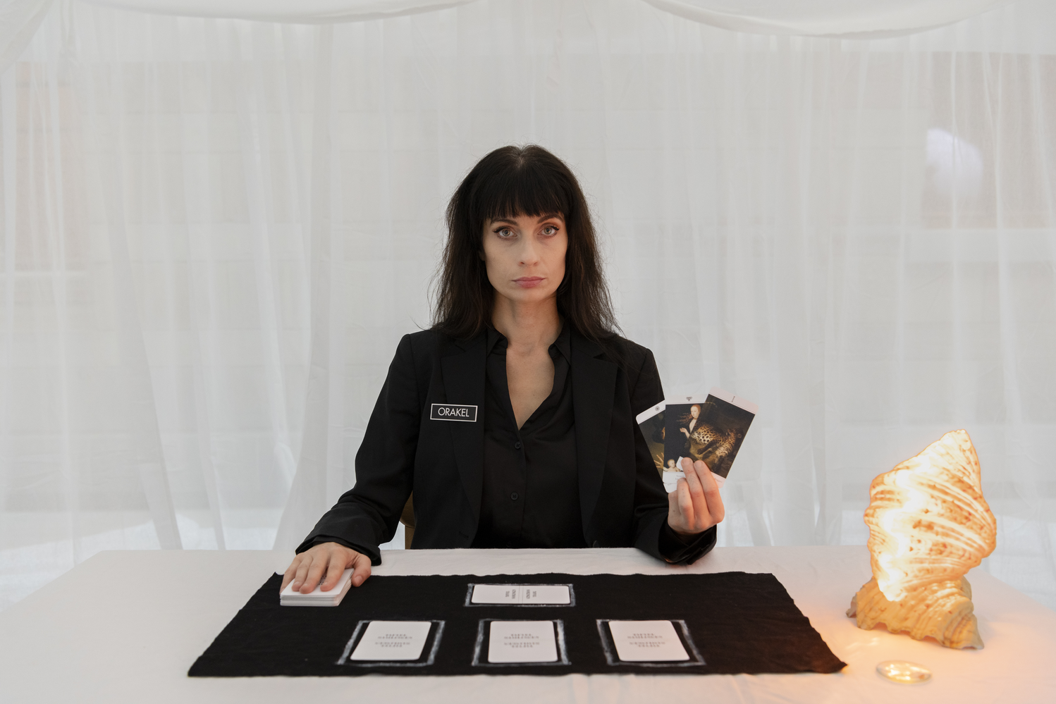 När besökaren kommer in på Nationalmuseum får hen genast veta att ett orakel väntar. Först när besökaren kan säga vilken nyans av blå som är den egna längtans blå, hur tillförsikt doftar och hur sorg känns att röra vid, visas hen in i oraklets tält. Oraklet lägger sina kort och motiven visar målningar från 1600-, 1700- och 1800-talet. Ett av korten lämnas nedvänt och besökaren ombeds att försöka föreställa sig det för sitt inre. Väl ute ur tältet förs besökaren genom Skulpturgården och dess marmorkroppar, in i Skattkammarens dunkla samlingar, uppför långa trappor och vidare in i huset. Genom dans och kryptiska frågor försöker museets värdar hjälpa besökaren att tolka sin spådom. Plötsligt står besökaren framför en bild som hen själv, steg för steg, har hittat på.