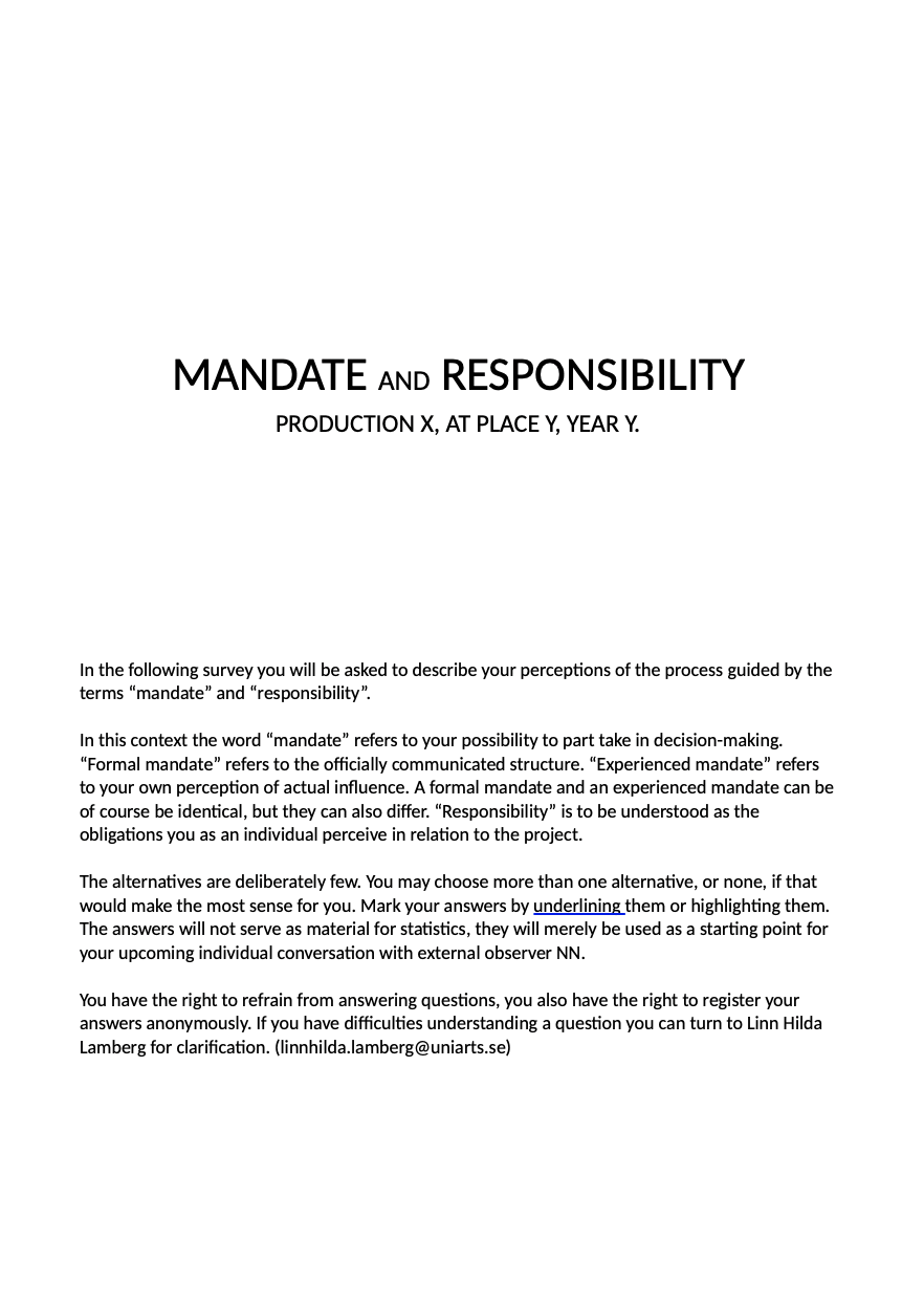 Vid ett antal tillfällen har jag bett om att få ta del av mina medarbetares reflektioner kring det gemensamma arbetet. Vid dessa tillfällen har de som anmält intresse delat sina reflektioner genom samtal med en tredje part.1 Som förberedelse inför samtalen har jag bett de medverkande att reflektera över processen med hjälp av en särskilt utformad enkät som på olika sätt lyfter frågor gällande mandat och ansvar. Enkätsvaren har inte använts som statistiskt underlag i forskningen utan har enbart fungerat som underlag för samtalet. De medverkande har erbjudits att få sina uppgifter anonymiserade innan de överlämnats till forskningen, de har också erbjudits möjlighet att dra tillbaka sitt medverkande.