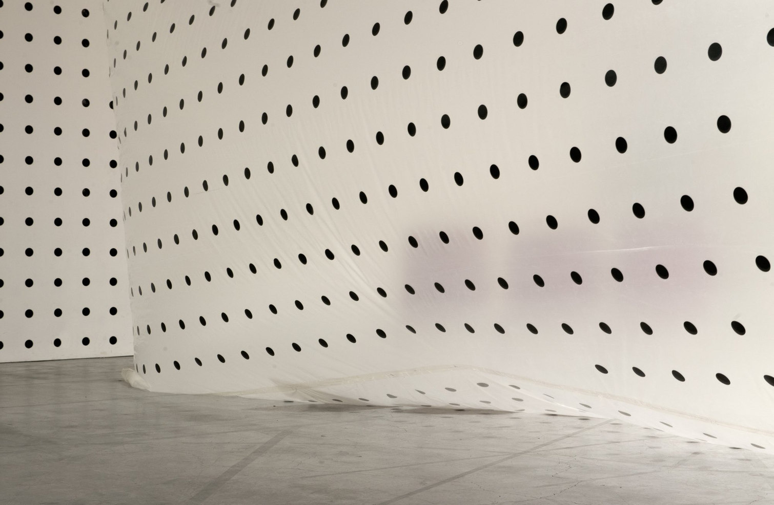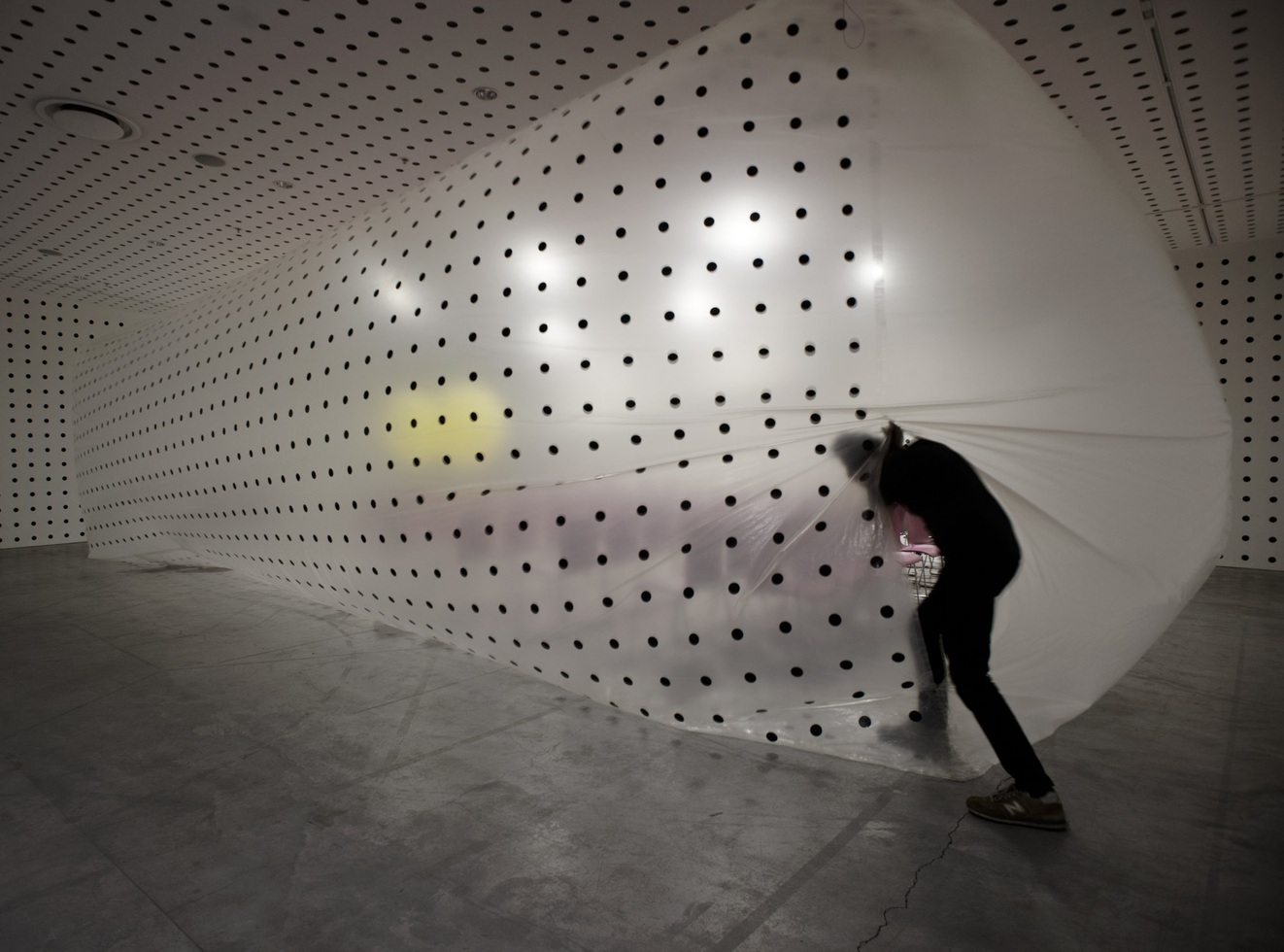 Crucially, the grid of black dots was replicated at the same size and scale as the surrounding environment, and the reorientation and doubling of spaces created an optical effect of vortex-like spirals in the misalignment of patternings where the rigid language of the building came into dialogue with the soft inflatable skin – a sort of talking over the top of each other. AJ8 took the language of the Design Hub and ‘rephrased’ it, disrupting its more regular rhythms. In doing so, the project emerged as something that is almost of the same architecture, but with a strangeness or excessiveness that distinguishes it from, and points back to, the quirks of the surrounding environment.