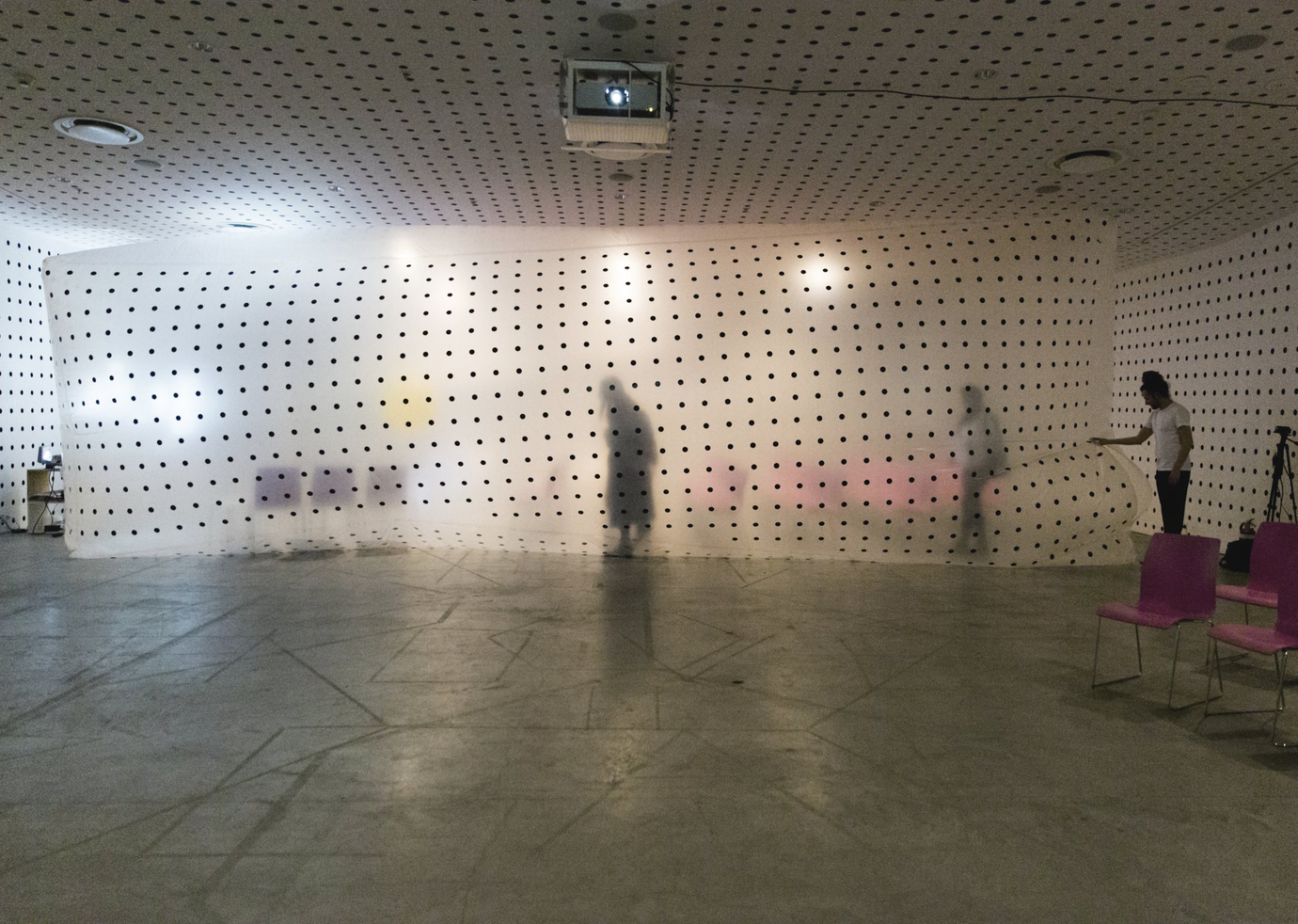 Spiralling optical effects created in the doubling and misalignment of the patterned surfaces of AJ8 and the lecture room walls.