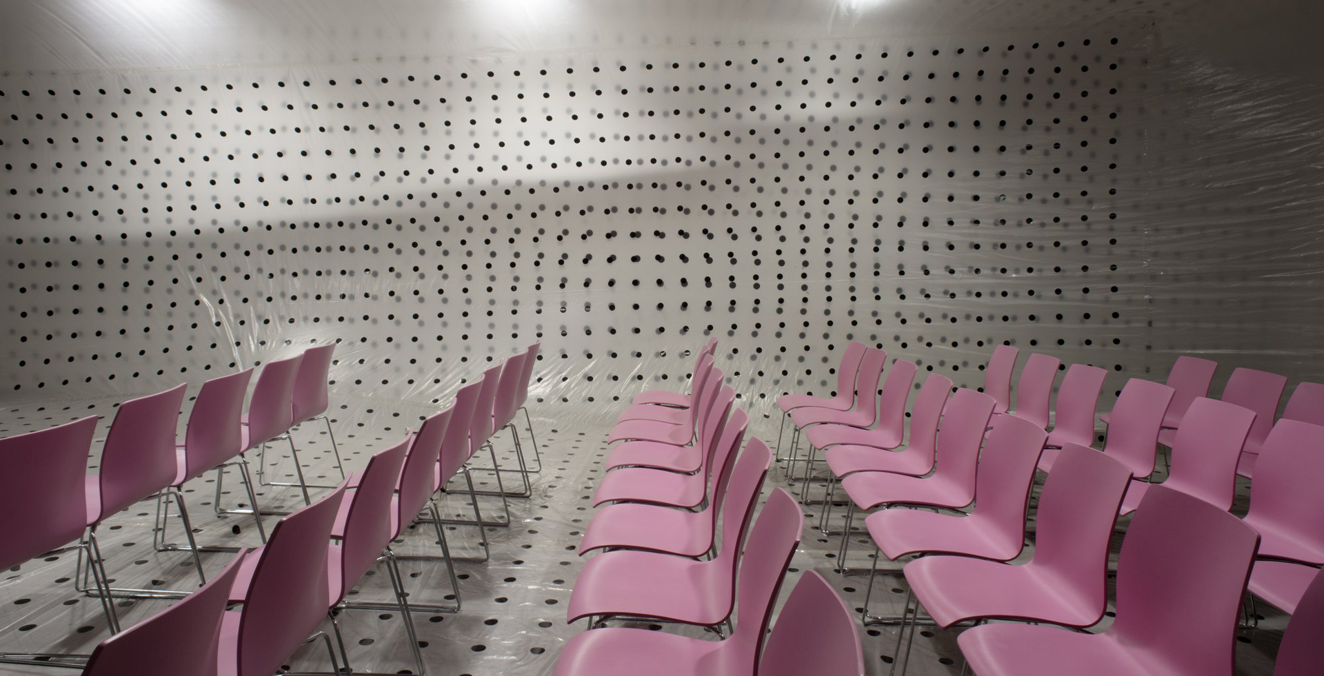 AJ8 (2016) was a later project that built on the successful engagement of the Building Movements projects with air and patterning, as well as the questions raised through our experimental reflective writing project. These techniques and ideas were transposed into a dialogue with one of the basement spaces in the RMIT Design Hub building at a larger scale. An inflatable replica of the room in which it was housed, this smaller, softer lecture theatre took the surrounding interior volume, reduced it by half across the X and Y axes, rotated it by 90° and then flipped it upside-down. This inflatable lecture room was 10m long by 6.5m wide, with a raking floor that mirrored the sloping ceiling of the main space.