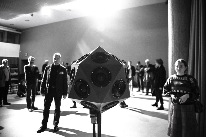 27/11/2015 Gerriet K. Sharma was opening the concert evening with mirage 1 at KUBUS of ZKM Karlsruhe. It was the first presentation of the IKO with reflector shields on a stage and the audience in front.