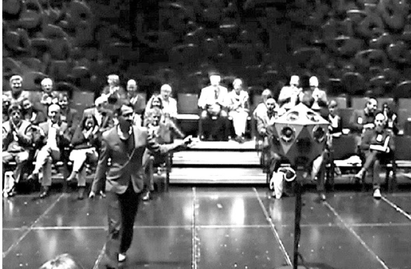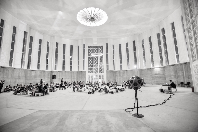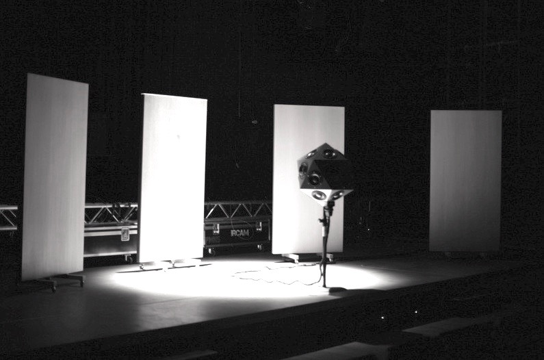 The performance concept was to present the IKO placed in the middle of the concert hall with the audience on two sides and reflector shields hanging from the ceiling.