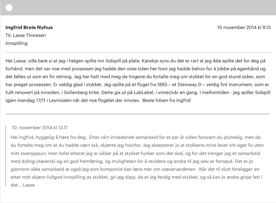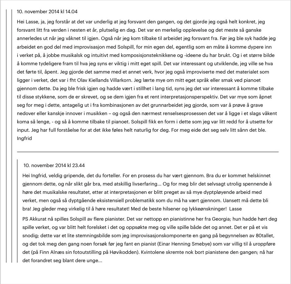 Jeg møter Lasse Thoresen på hans kontor i fjerde etasje ved Norges musikkhøgskole. Han forteller om Solspill, og jeg skribler ned: