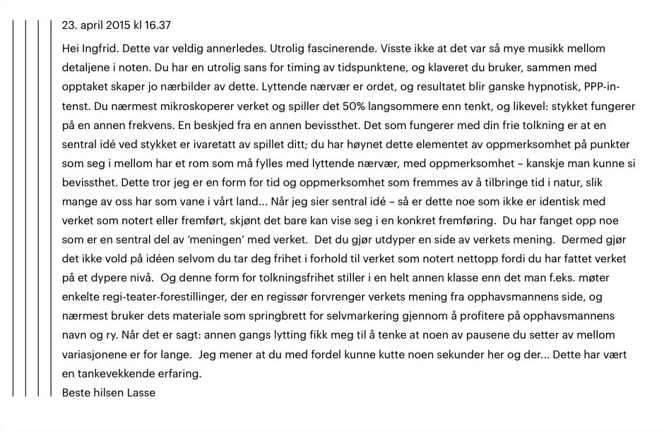 Siste variasjon: Tilbake til tema. Det svares i understemmen, i omvending, transponert til A-tonalitet. Langeleikaktig bordun som en skygge. En skyggemelodi som kryper innimellom, og en veldig profilert hovedmelodi. Helt til slutt konturen av klokkemotivet. En slags mini-rekapitulasjon på siste side. Hvis du skal lage flere variasjoner eller improvisasjoner, som du nevnte, i sammenheng med dette, så velg en annen toneart. Var det ikke forresten Edwin Fisher som sverget til improvisasjon som metode for å komme inn i verket? (Lasse Thoresen, i samtale 3. oktober 2012)