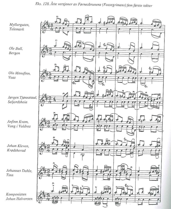 Åtte noteeksempler på de første taktene av Førnesbrunen (Aksdal & Nyhus, 1993, s. 314).