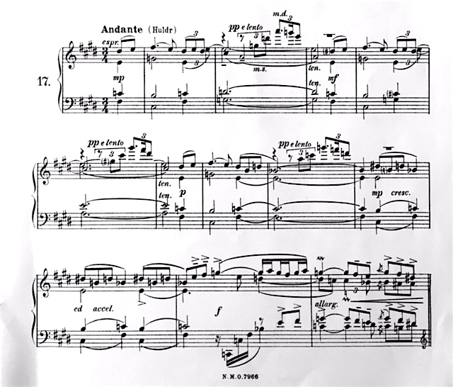 Overskriften 'som om det er folkemusikk', preger også de formmessige valgene, ved at ideen om variabilitet og det gehørsbaserte, får styre. Arbeidet med å øve uten å lese på notene hadde gitt meg en kroppslig frihet med motivene. Den ga mulighet for mikrovarieringer i spillet. Musikken føles friskere i hendene mine, når den aldri får ha helt samme form. Dette lydeksempelet fra «Huldr» kan ses i forhold til notene under.