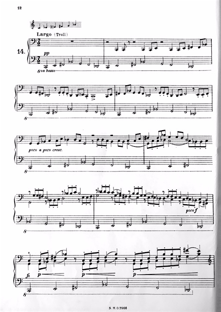 Innimellom i verket opplevde jeg at det folkemusikalske og det kunstmusikalske møttes naturlig, mens andre steder opplevde jeg det som en direkte kollisjon mellom to ulike verdener. Flere av satsene er komponert over eldre kunstmusikalske former, som i noteeksemplene under. Sats nr 13 er en barokkinspirert fugert sats. Sats 14, «Troll», er bygget som en jevn dynamisk stigning til en kraftig akkord. Både fugeform og en slik stigende form står veldig langt unna folkemusikkens repetitive former: