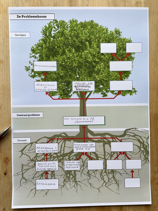 Ik heb een kleine maaksessie gedaan met Rosa en Than om op een fisiuele manier AI beter te begrijpen en de pijnpunten in kaart te brengen. Online heb ik opgezocht hoe een probleemboom eruit ziet en heb ik het in Canva zelf nagemaakt voor dit onderzoeksmoment.