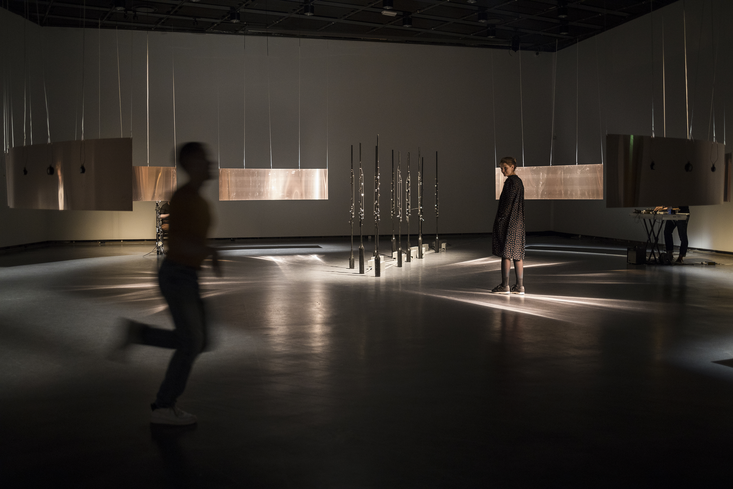 The floor of the space is divided into zones observed by a camera. The activity inside these zones – that is, the presence of the audience and the duration of their presence and movements – is used as a factor that triggers different arbitrary chains in an aleatory composition programmed in MaxMSP. The programme sends commands to twelve string columns that form a core in the middle of the space. The sound of the string columns is then sent back to three transducer speakers within each of the copper panels (six panels and 18 transducers in total). The transducers excite the copper panels, which resonate like speaker membranes and colour the sonic quality with their own resonance. At certain frequencies the resonance triggers a physical vibration in the material so that the copper sounds almost like a cymbal and reflects the light in the room like the sun shining on the water’s surface during a blood-red sunset.