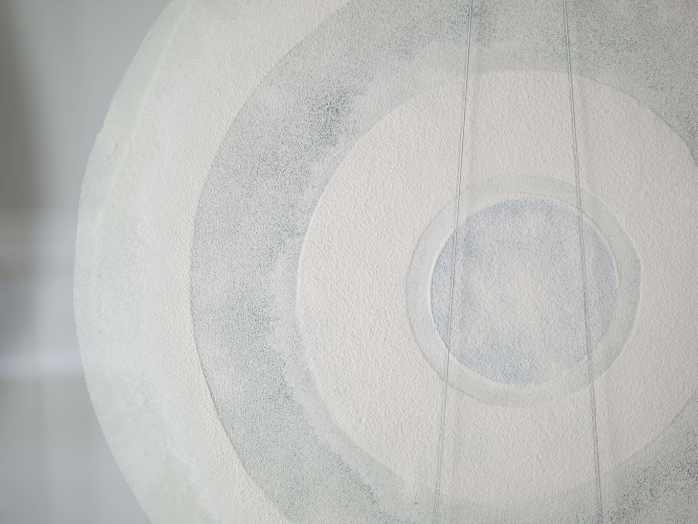 The large glass panels have been prepared with circular ornaments reminiscent of Hilma af Klimt’s paintings3 but have been made from thick layers of dry colour pigment and plaster. The ornaments dampen the vibrations in different ways and therefore create micro-differences in the sound, but they primarily have an effect on how we perceive the sound, the temperature, the weight, based on the visual impression and the material presence. The ornaments also highlight the overlaps, or beats, between the panels as they turn and continually create new calibrations of depth, density, opacity, transparency. The basic rectangular shapes of the glass panels slowly but surely morph into a kaleidoscope which challenges our perceptions of fixed shapes.