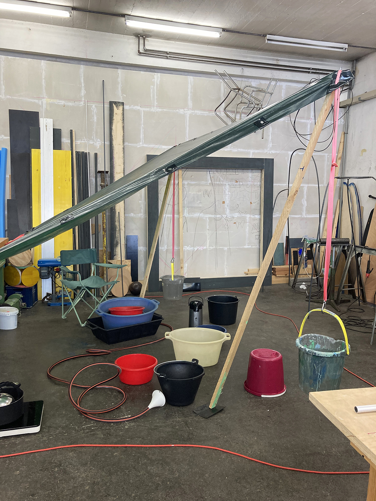 The heart of the infrastructure is a lightweight tent that functions as a semi-permeable shelter – at once protective and open (see figures 14 and 15). The shelter consists of a tarpaulin (2×3 meters) that can be attached to an existing infrastructure or trees in public spaces with two ropes. On the opposite side, two wooden poles serve as supports, while buckets filled with water act as counterweights. The shelter can only be put up through collective performance — a joint effort to build a fragile and flexible installation that is in constant flux.