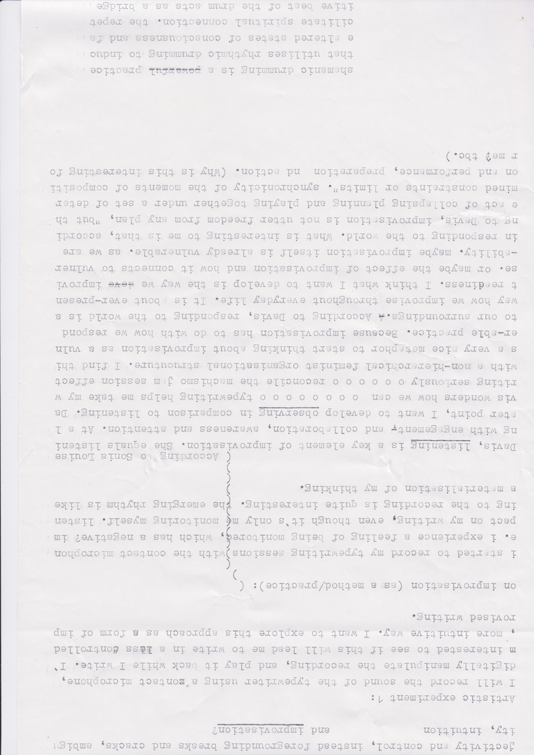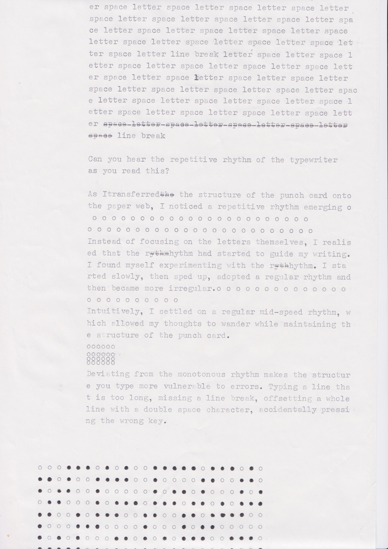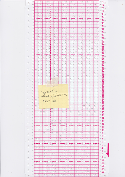 The typewriter disrupts that supposed linearity and lays bare my train of thought. It leaves signs of the enthusiasm with which I struck each key, and in doing so calls into question the objectivity I am meant to uphold as a researcher. It wrests control from me. It unsettles the rhythm imposed upon me.