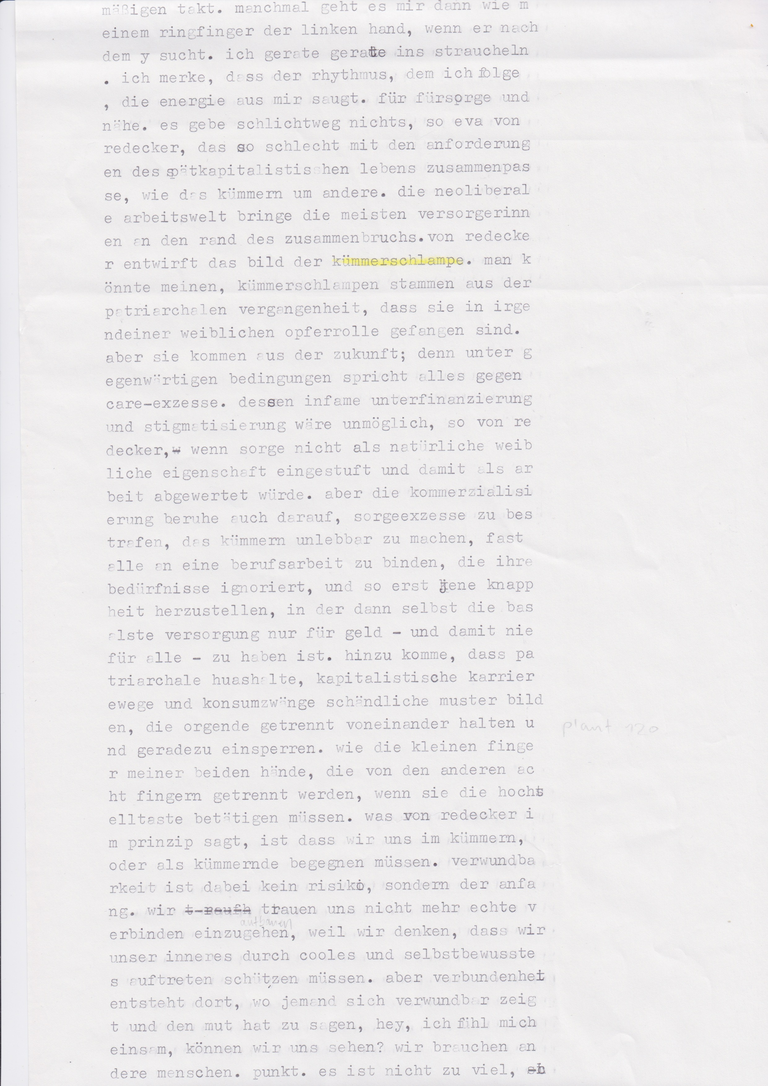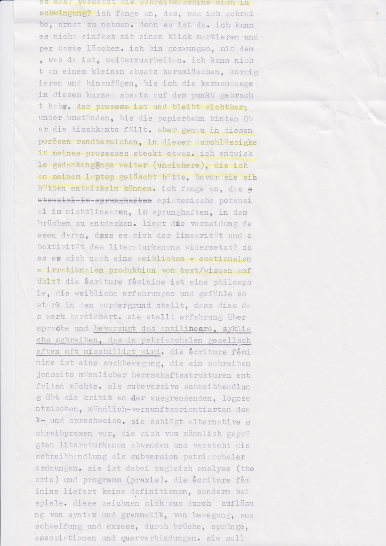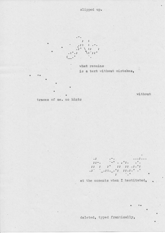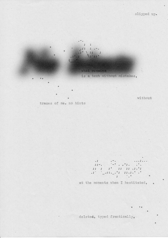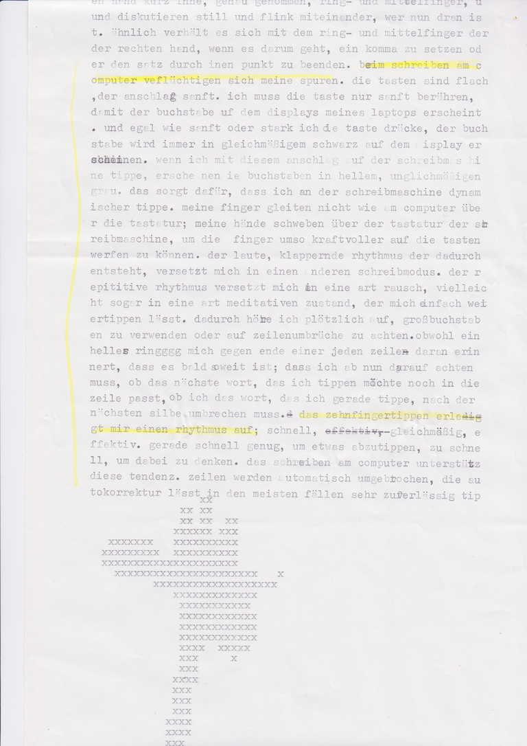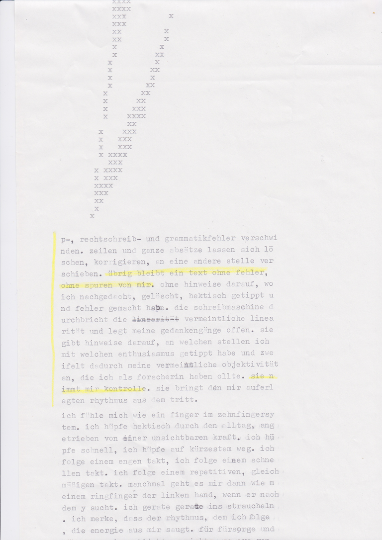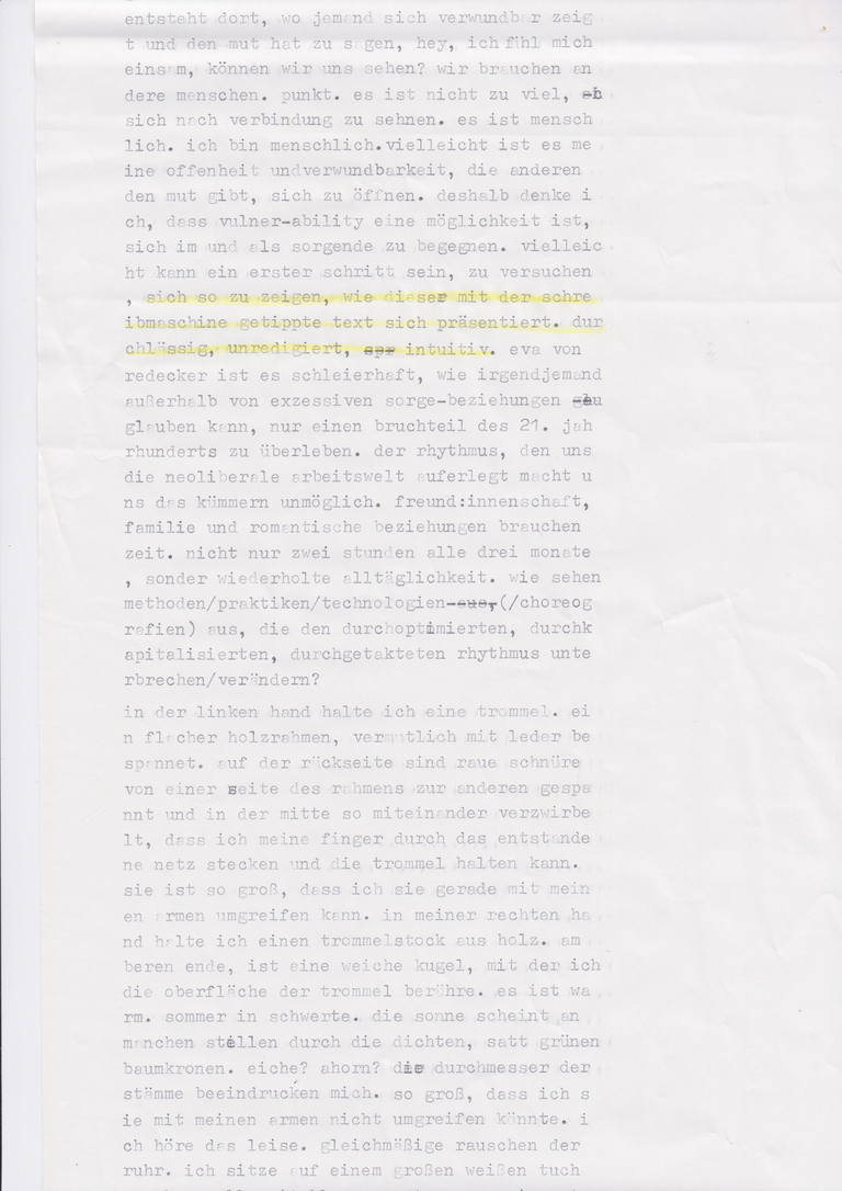 I take the long sheet of paper, which feeds line by line from the typewriter, into my hands and hold it up above the machine. I see sentences I would like to delete. I see paragraphs I want to rephrase. There are also typos, an extra comma. Questions and statements that I have already developed further in the process of writing and want to work on. I can tell from the irregularity—or uniformity—of the typing where I typed listlessly, where I typed energetically. Where I have tentatively and uncertainly set down a provisional thought. I try to embrace these human traces in the text, my traces, and to understand them as productive in the sense of vulnerability. And indeed— the more I write, the more I lose the fear of leaving these traces behind.