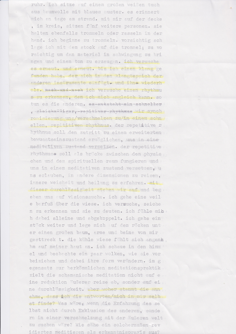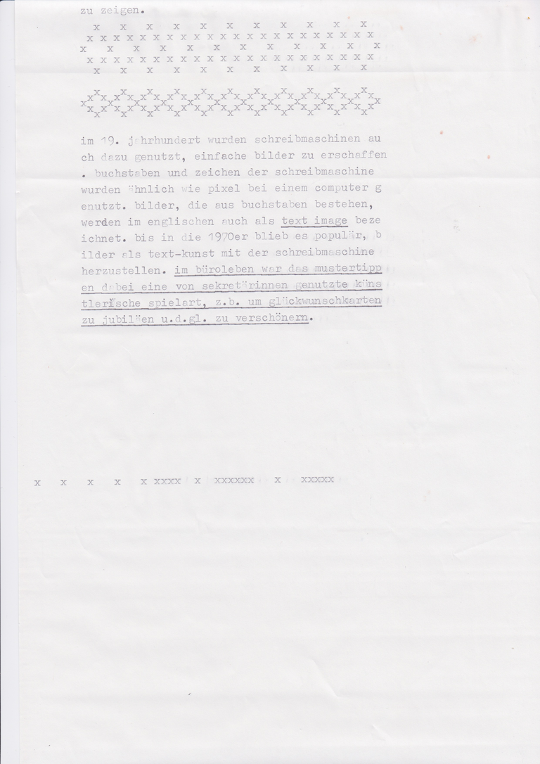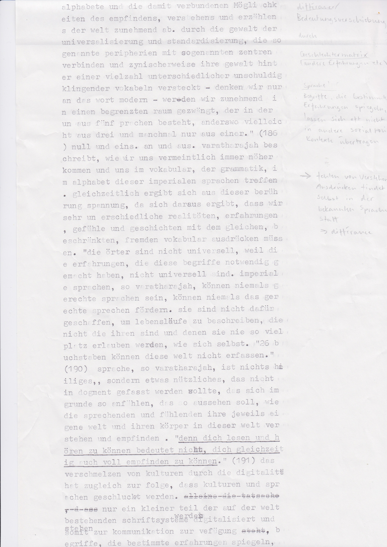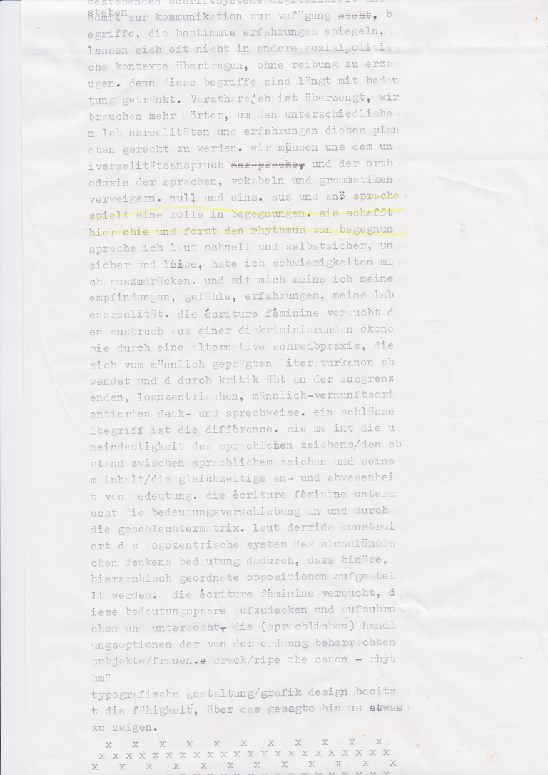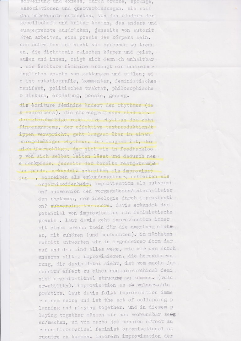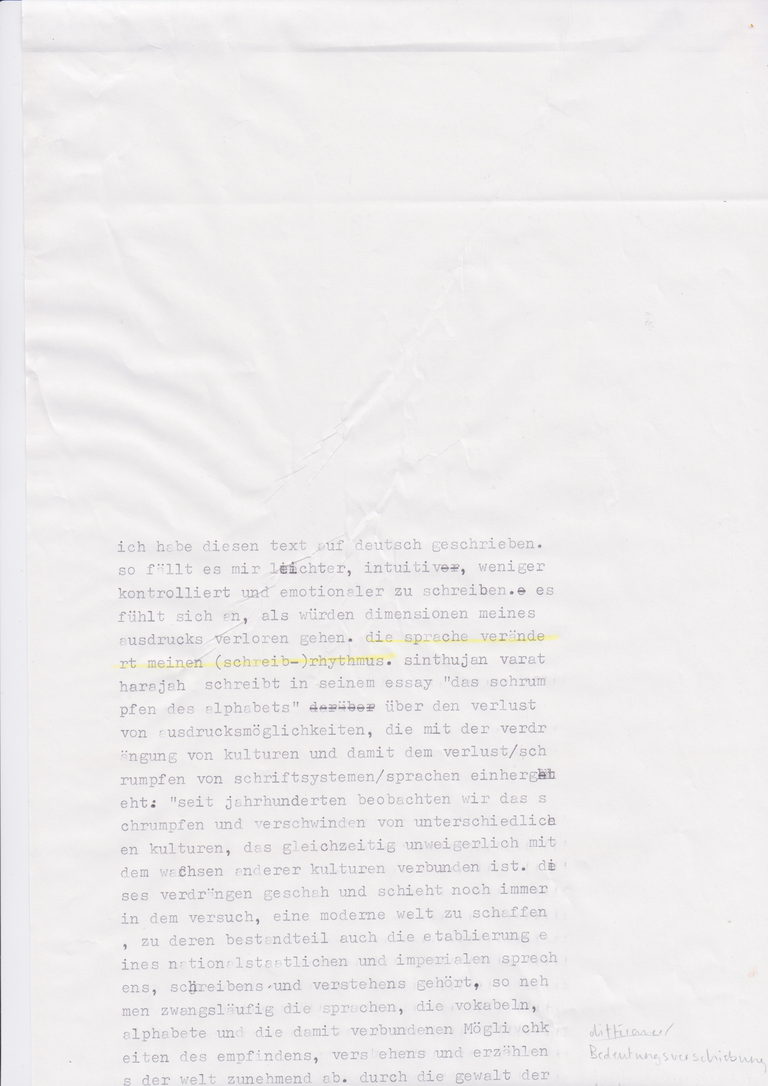 I take the long sheet of paper, which feeds line by line from the typewriter, into my hands and hold it up above the machine. I see sentences I would like to delete. I see paragraphs I want to rephrase. There are also typos, an extra comma. Questions and statements that I have already developed further in the process of writing and want to work on. I can tell from the irregularity—or uniformity—of the typing where I typed listlessly, where I typed energetically. Where I have tentatively and uncertainly set down a provisional thought. I try to embrace these human traces in the text, my traces, and to understand them as productive in the sense of vulnerability. And indeed— the more I write, the more I lose the fear of leaving these traces behind.