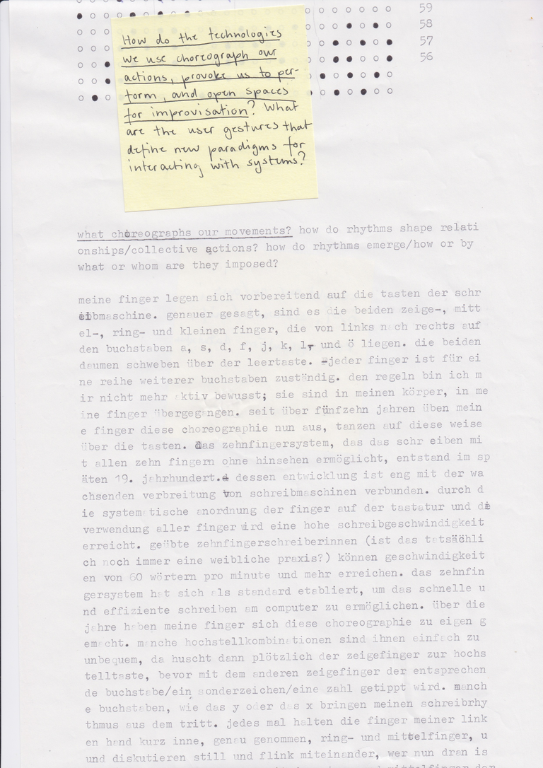 The ten-finger system imposes a rhythm on me—quick, steady, efficient. Just fast enough for transcription, too fast for real thinking. Writing on the computer reinforces this tendency. Lines break automatically, autocorrect makes most typing, spelling, and grammar mistakes disappear with ease. Whole lines and paragraphs can be deleted, corrected, shifted elsewhere. What remains is a text without mistakes, without traces of me. No hints at the moments when I hesitated, deleted, typed frantically, or slipped up.