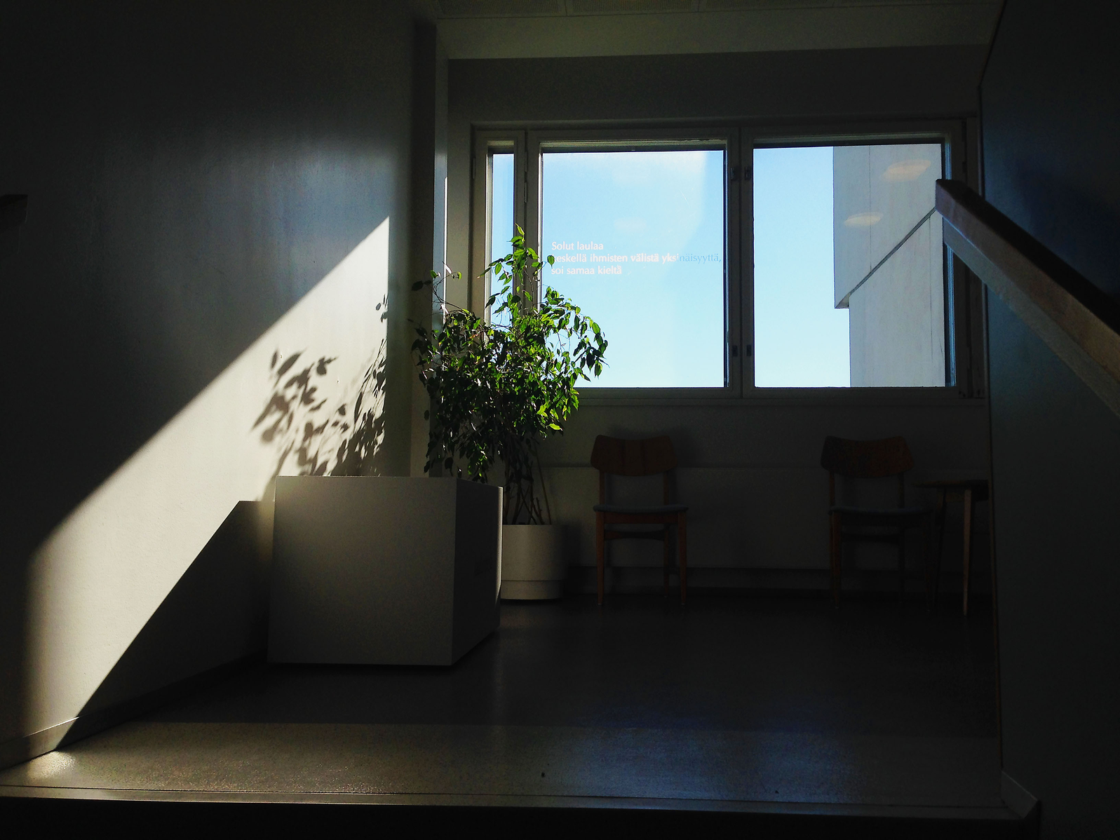 Perhaps the most palpable way to account for the embodied and affective transitions catalysed by the composition was through the pattern of mutual silence in the hospital stairwell. The ways in which many people attuned to the silent states of listening seemed to invoke a sensitivity that brought about embodied changes, which were felt and noticed by many. But how to talk about the ambiguous phenomenon of attuning to listen, and becoming sensitive to rigorously encountering what one hears and senses? Particularly since this cannot (for the thoroughly in-between quality of the phenomenon) be introduced as an object of knowledge?1 The notion of atmosphere helps to illuminate the specific, affective quality of such an experience of listening as a relation. As one entered the stairwell from the wards, or the main entrance, one was first and foremost faced with the intimate, vibrating atmosphere — not an art object — which people experienced through their bodies and their sensate knowledge. According to Vadén and Torvinen, atmospheric experience precedes the identification of separate entities.2 Anderson argues that ‘affective atmospheres are a class of experience that occur before and alongside the formation of subjectivity, across human and non-human materialities and in-between subject/object distinctions’.3 Such an in-between sphere is collectively available, as Vadén and Torvinen emphasise. However, it needs some human participation for it to affect.4 Consequently, I aim to map the ways in which people composed themselves in relation to this field of resonance in terms of sensate knowledge, and why this apparently embodied relational register might matter. I will enter the material reality of these moments, and the challenging issues that emerge from within, through my own situatedness.