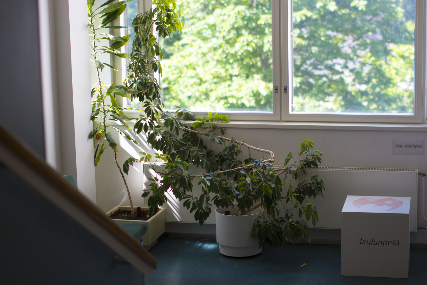 The question now was, how to unravel the experience of the uncanny within this specific environment? Let us start with the artistic choices. First of all, it is important to point out that the installation was not primarily actualised in a gallery space, but sensitively to the situation of the common stairwell of this specific and diverse community — a transitory space, unavoidable to those who work or receive treatment in the hospital. It was installed, in other words, in a highly regulated and an understandably rigid hospital space, which could be seen as a quite challenging place for participatory vocal sound art. Also, choosing the sound installation format to expose the process of Vocal Nest framed the possible ways of experiencing the composition. For example, it was not exactly possible to respond (verbally) to the piece.1