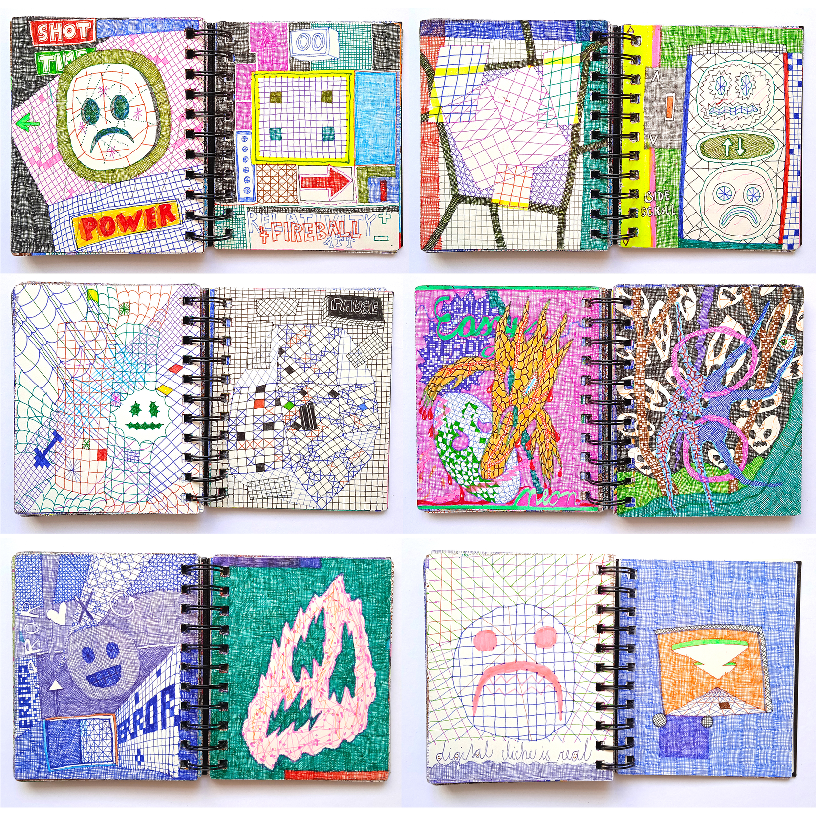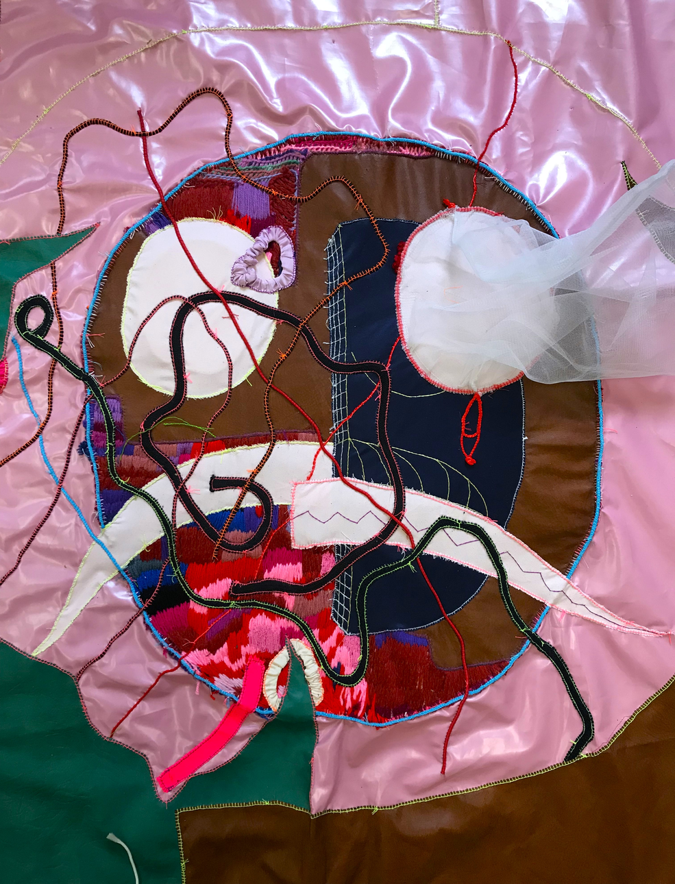 I create textile objects using a hand-sewn patchwork style with materials like faux leather, mesh, or “perlinka” (a grid fabric) that reference hyperlinks and cyberspace. I use grids and surface textures to show the networked quality of online and offline worlds. Everything is hand-sewn to preserve the material experience. The method lets me layer, overlap, and collage objects, exploring digital symbols, the body, and emotions. Drawing is my main way to link digital visuals with feelings and thoughts, thus showing complex psychological experiences. This also helps me reflect on how we communicate, show emotions, and interact in public and private life.