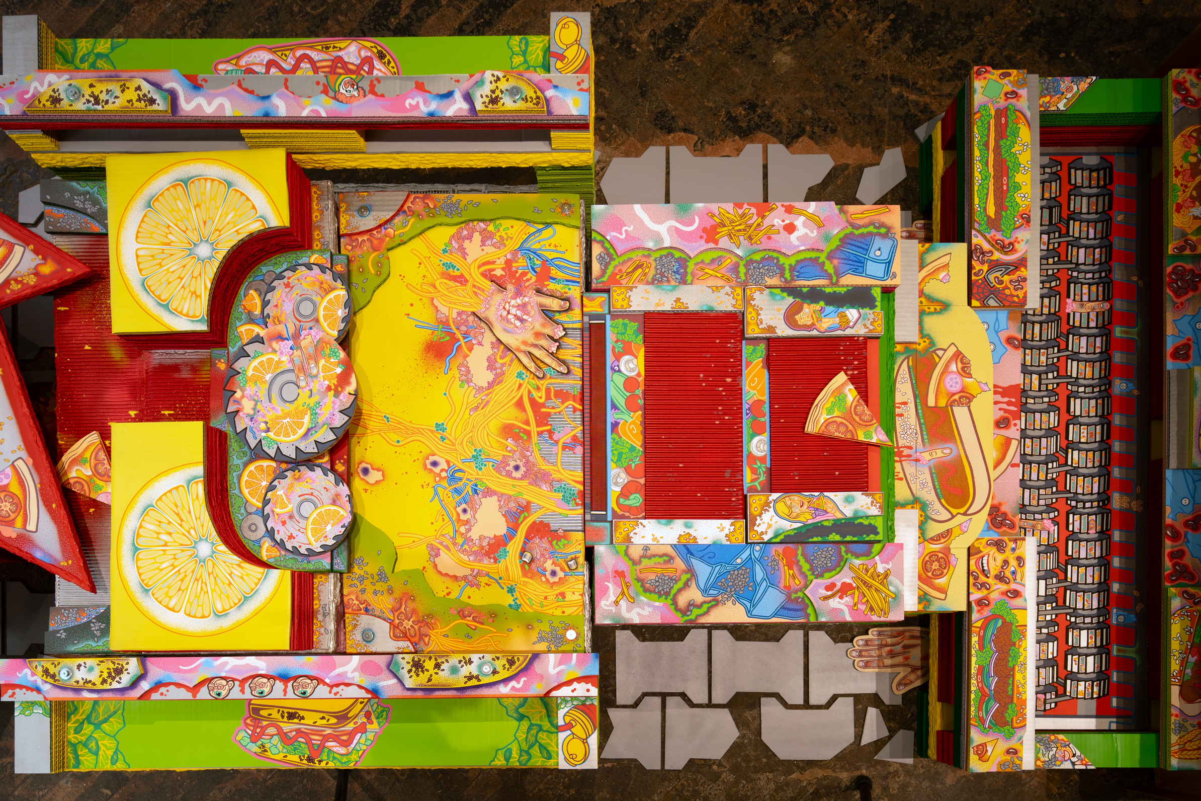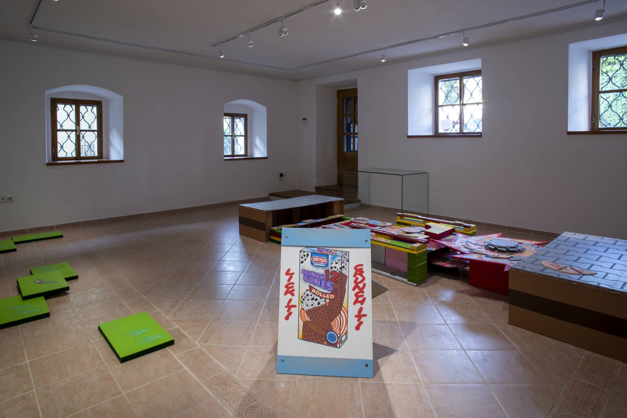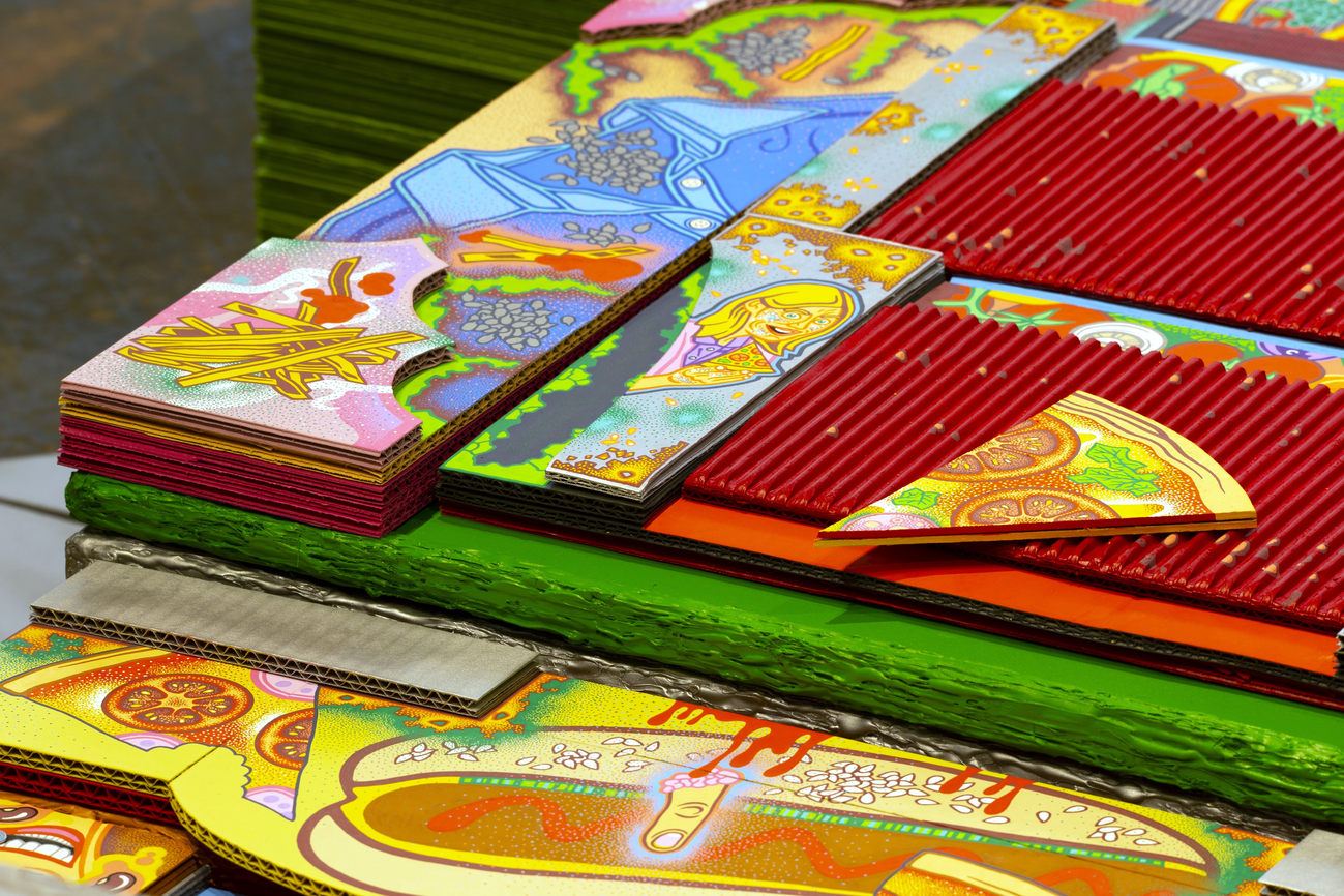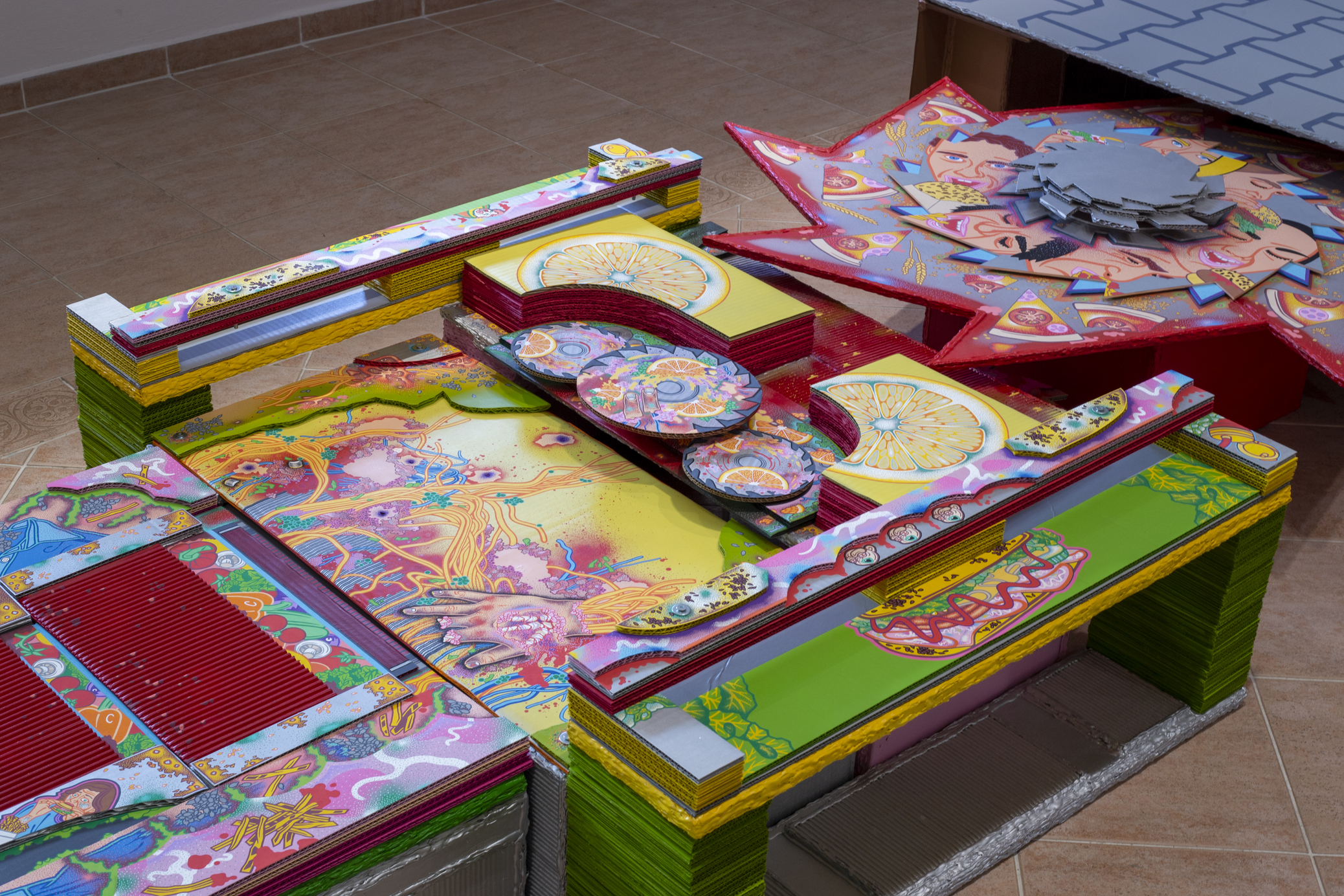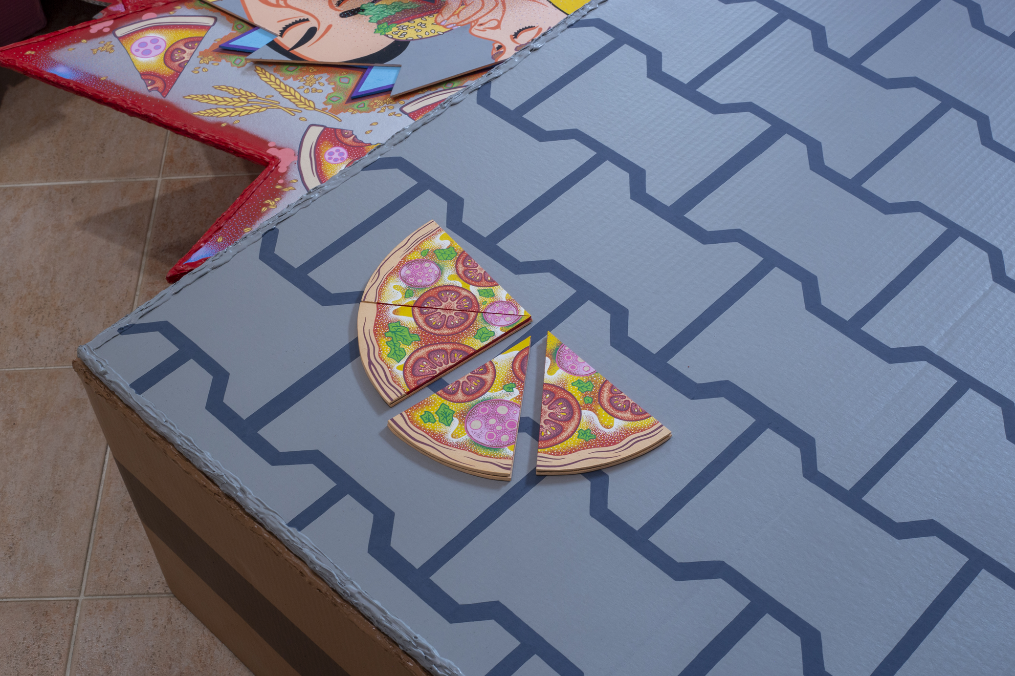 The main construction material is found, recyclable cardboard, which serves well for creating buildings and immersive installations, giving it a similar character to a film prop. Typically composed of glued layers of paper, cardboard is used for boxes and packaging, varying in thickness and strength, taking new forms—it becomes a slice of toast, a moldy baguette wrapped in aluminum foil, or a chocolate bar from a mad Willy Wonka factory. It also appears as a pizza on a slowly rotating circular wheel or a baked crust detailed with crème drawings of human tissue, crushed tomatoes, or spaghetti carbonara.