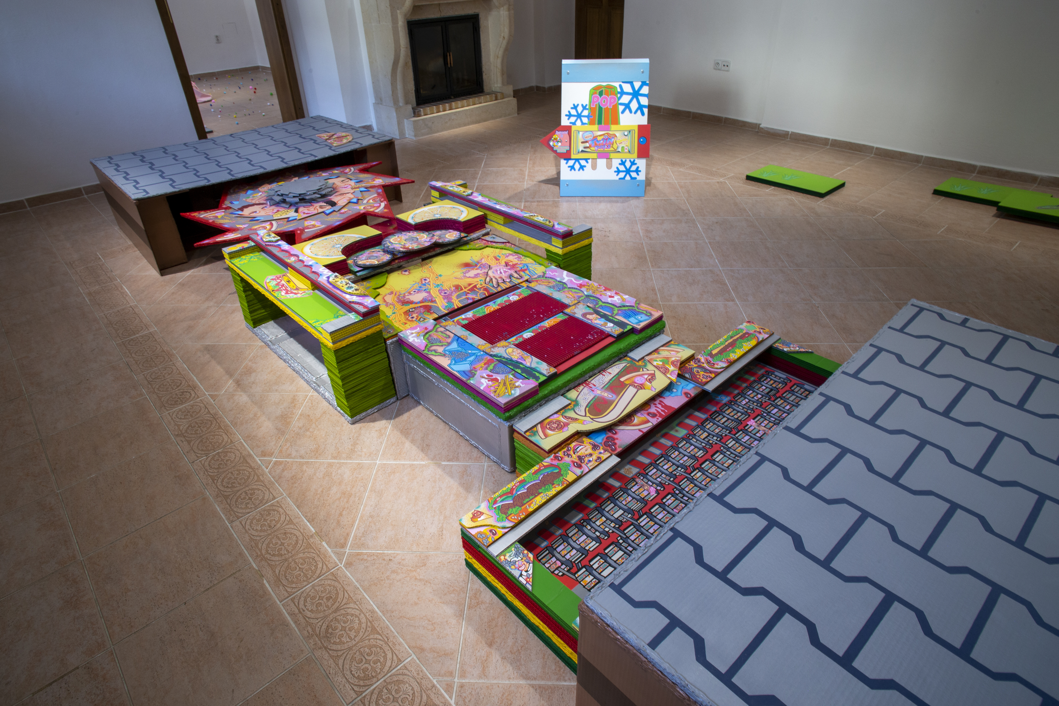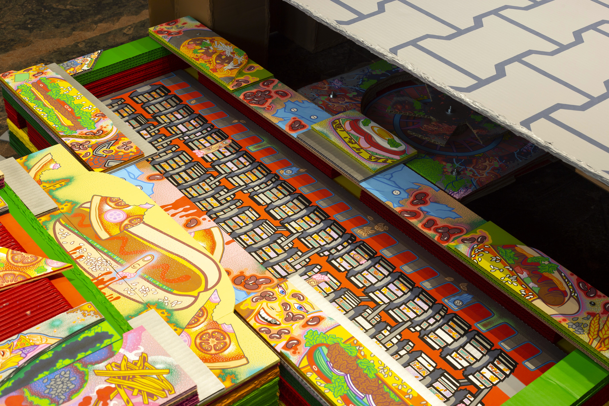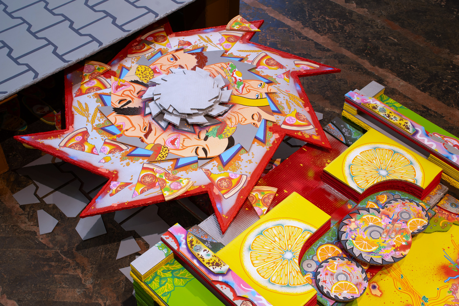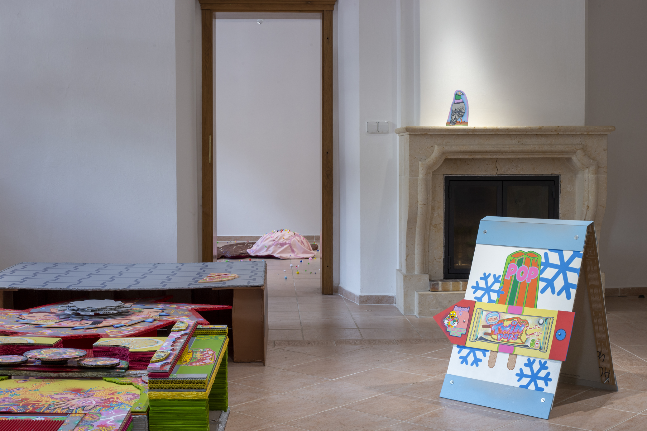 The main construction material is found, recyclable cardboard, which serves well for creating buildings and immersive installations, giving it a similar character to a film prop. Typically composed of glued layers of paper, cardboard is used for boxes and packaging, varying in thickness and strength, taking new forms—it becomes a slice of toast, a moldy baguette wrapped in aluminum foil, or a chocolate bar from a mad Willy Wonka factory. It also appears as a pizza on a slowly rotating circular wheel or a baked crust detailed with crème drawings of human tissue, crushed tomatoes, or spaghetti carbonara.